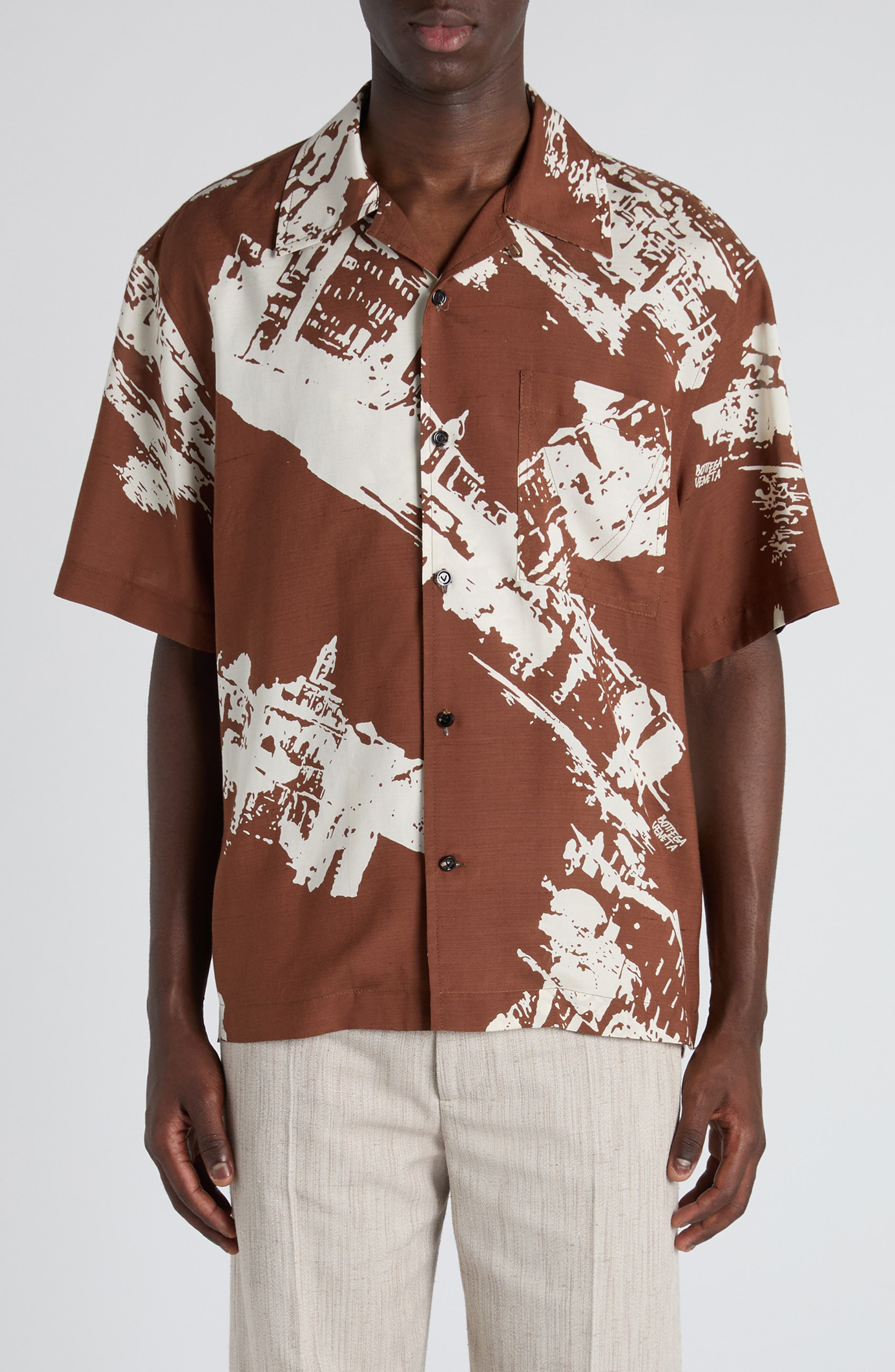 Bottega Veneta Postcard Print Silk Blend Camp Shirt in 2154 Pecan/Dove at Nordstrom