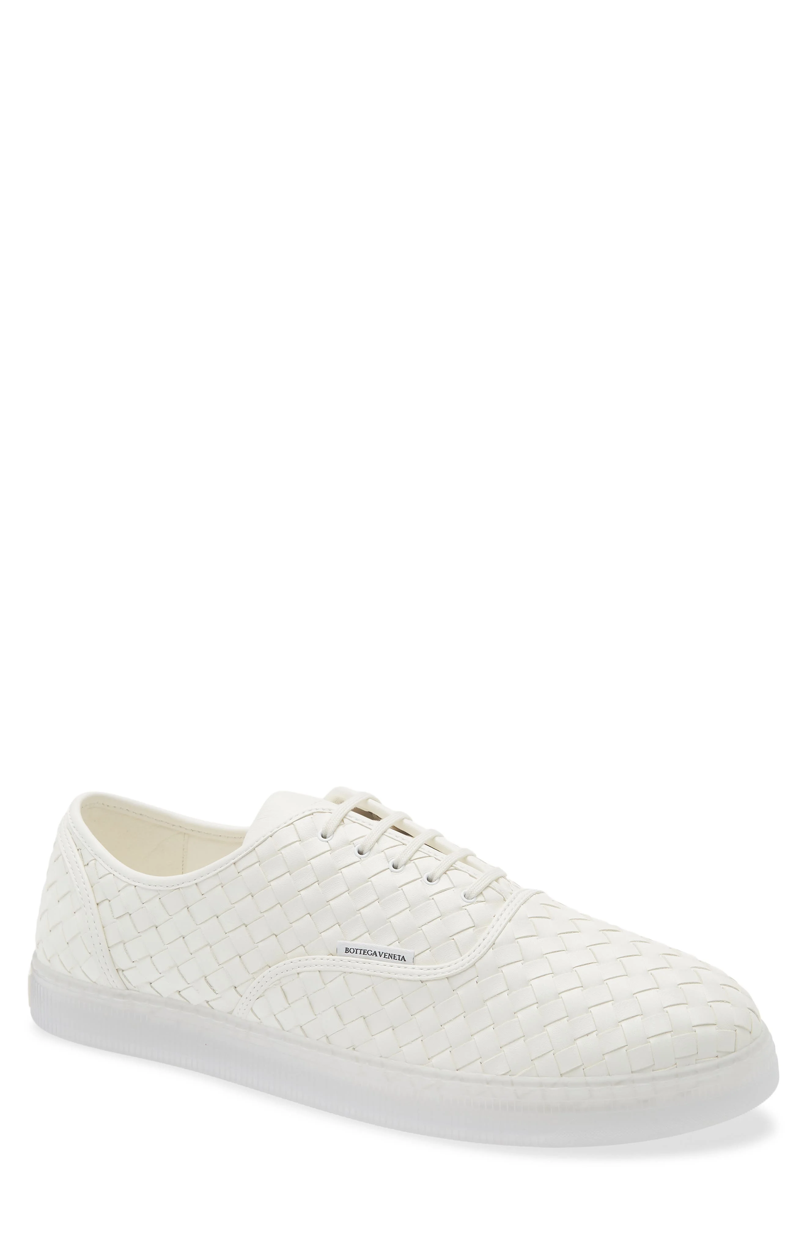 The label's house-signature intrecciato weave textures this low-profile sneaker crafted from rich Italian leather and set on a transparent rubber sole. Lace-up style Leather upper and lining/rubber sole Made in Italy Designer Shoes