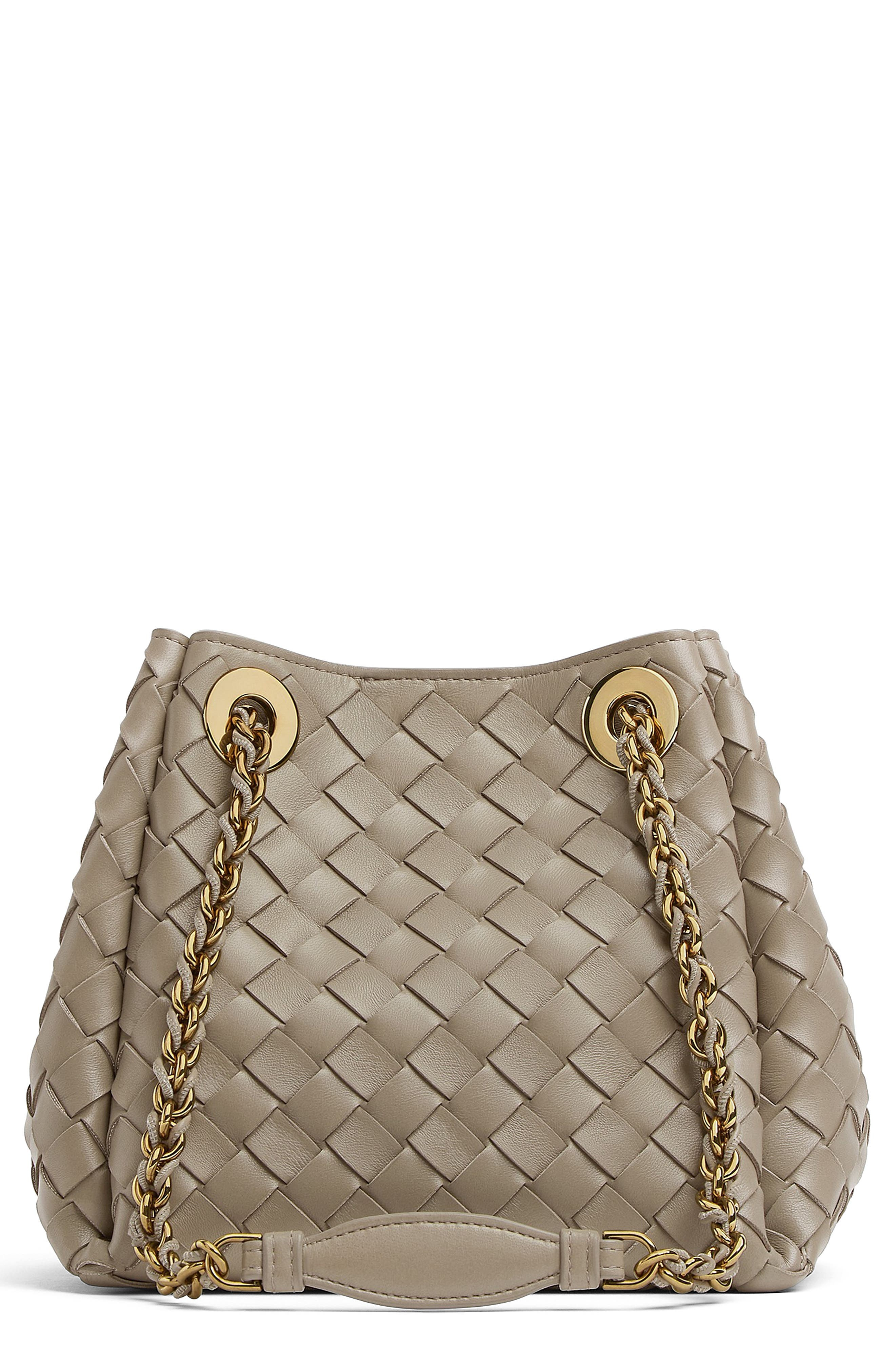 The label's signature intrecciato technique textures this lambskin-leather bucket bag that features a sliding chain strap that easily adjusts for shoulder or crossbody carry. Magnetic closure Pull-through chain strap Structured silhouette with flat base for stability Unlined Leather Made in Italy Designer Handbags