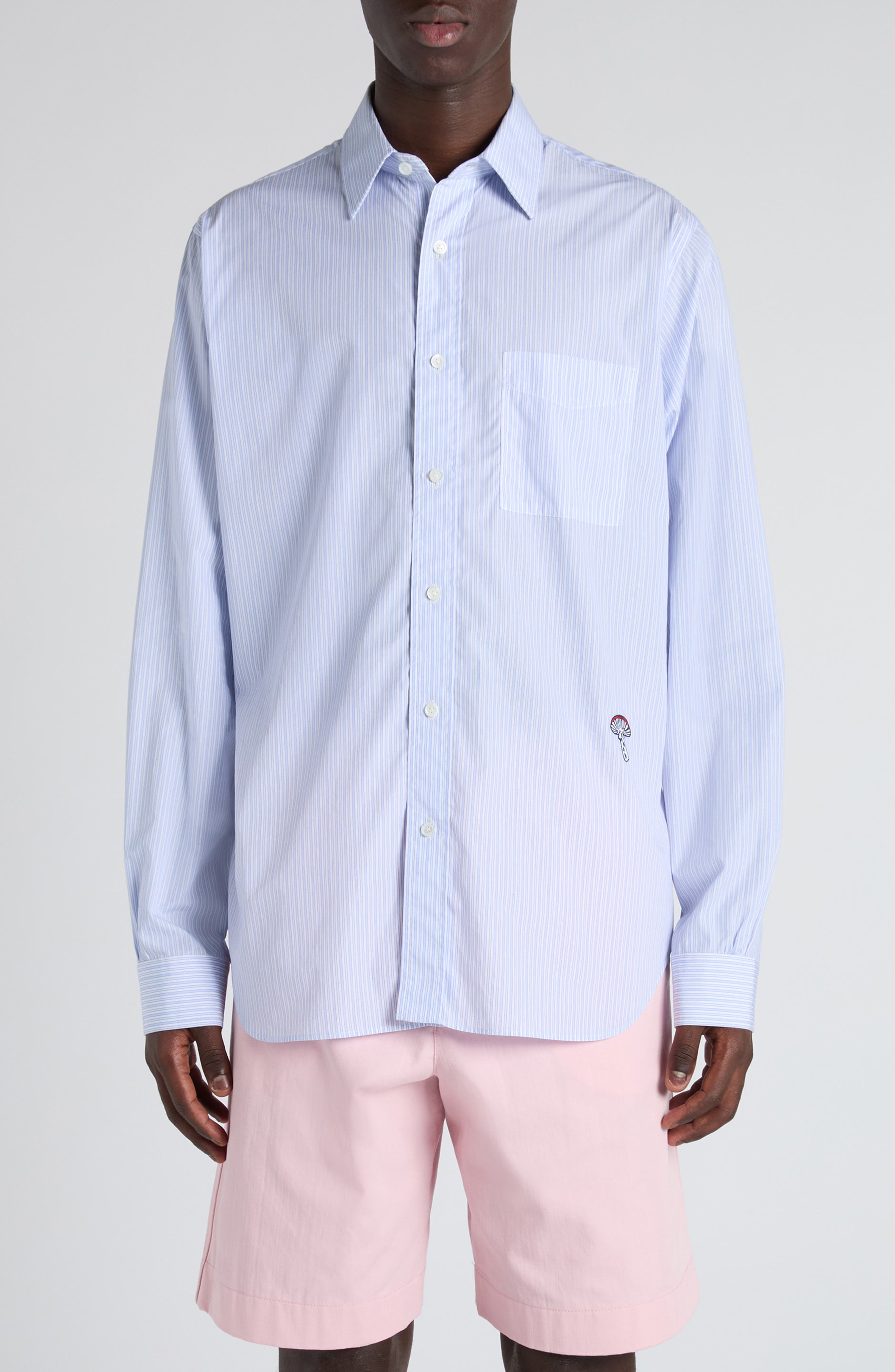 Matthieu Blazy taps into his signature childlike wonder with whimsical mushroom embroidery dancing at the hem of this laid-back button-up. Cut from airy cotton poplin and framed with a sharp point collar, it's the perfect mix of playfulness and polish. Front button closure Point collar Long sleeves with button cuffs Chest patch pocket Curved hem 100% cotton Dry clean Made in Italy Designer Clothing