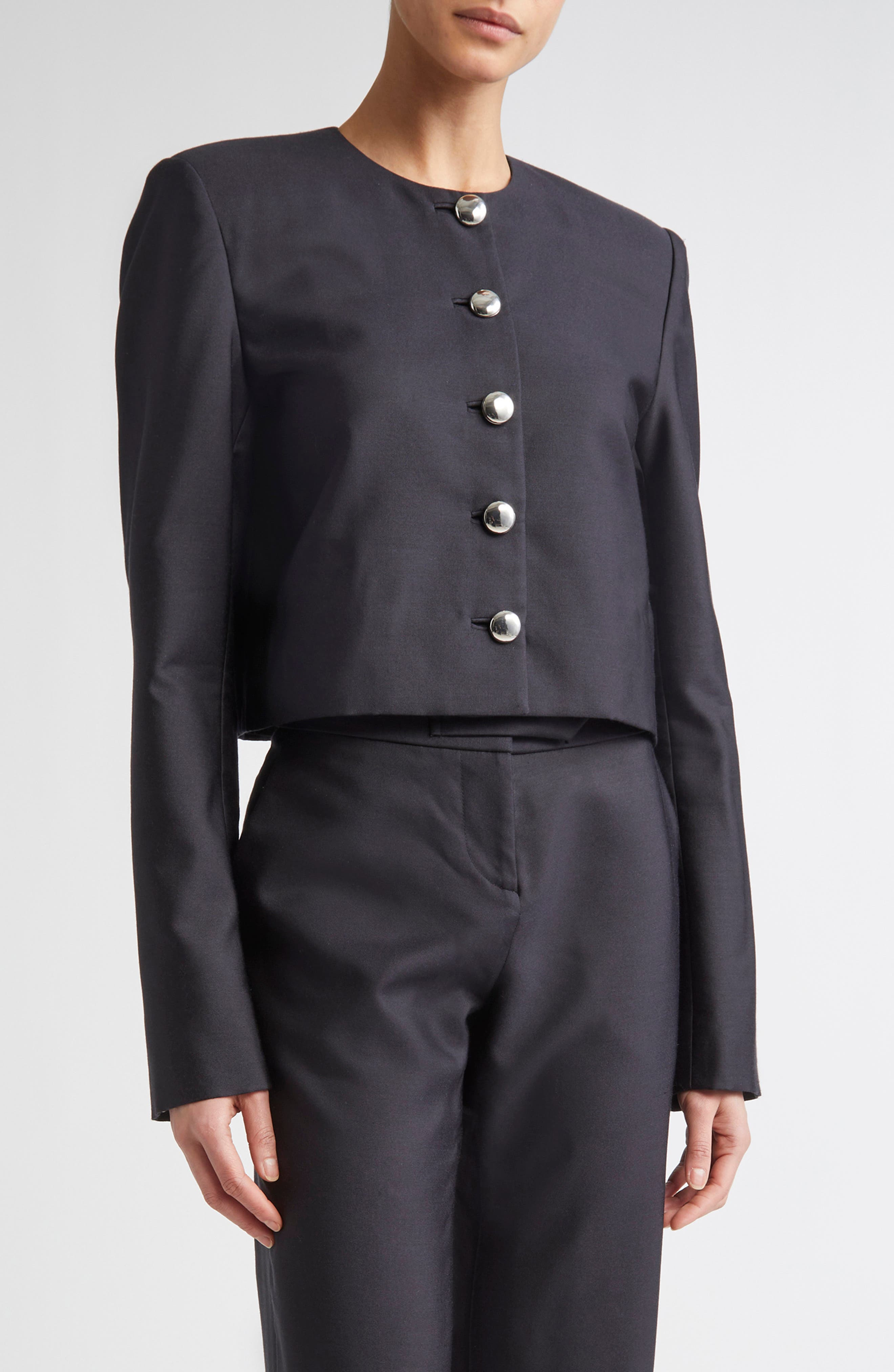 The pre-fall '25 collection’s signature macaroon buttons bring a refined finish to this sculptural jacket tailored from silk mikado in a boxy, cropped silhouette accented with sharp lines. Front button closure Jewel neck 100% silk Dry clean Made in the USA Designer Clothing