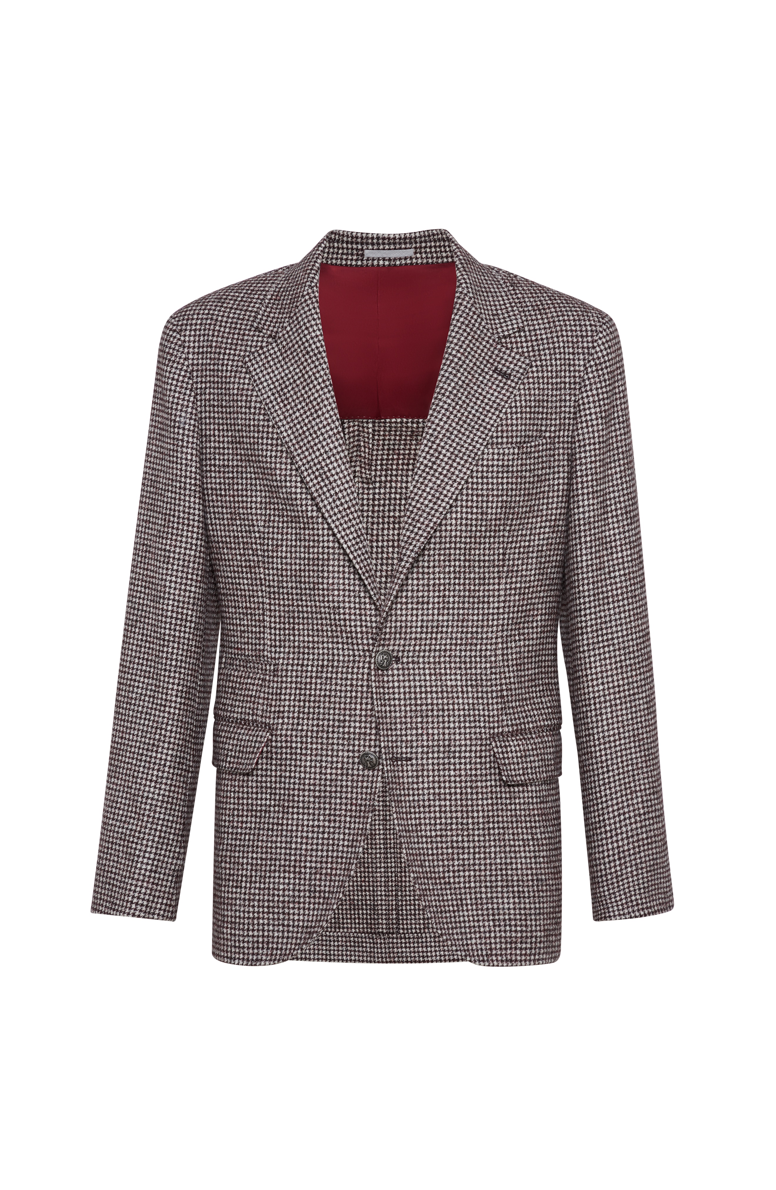 Long, airy alpaca fibers are blended together with wool to reinterpret the classic houndstooth pattern with a refined, retro-inspired nuanced effect. The small presence of synthetic fiber contributes to the fabric’s stability. The ultra-lightweight cupro lining perfects the garment’s comfort. 3-roll-2 closure with metal buttonsNotched lapelWelt pockets with flap, ticket pocket and chest pocketCuffs have four metal buttons and functional buttonholesHalf-linedTwo interior pockets with button closure and pen holderDouble back ventDrop 7