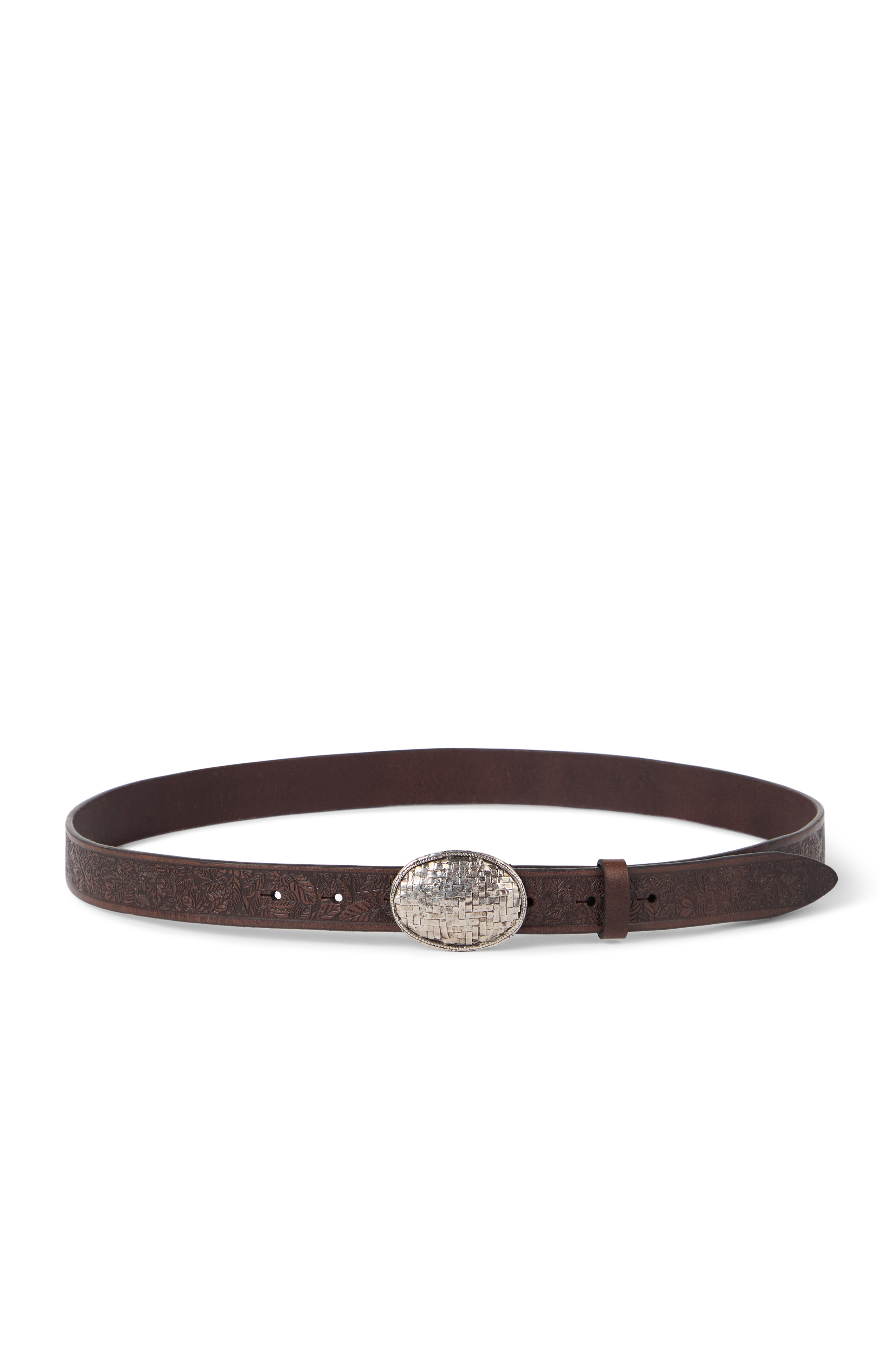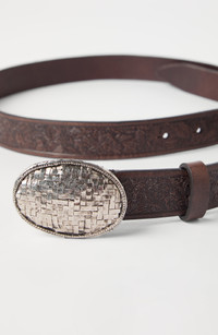 Leaf motif calfskin belt with braided metal buckle