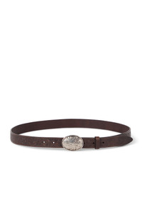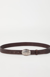 Smooth and firm, the refined calfskin leather is brought to life with a delicate leaf print that stands out on the leather's glossy surface. Belt height approx. 2.5 cm (0.98\") All metal parts are Nickel-free