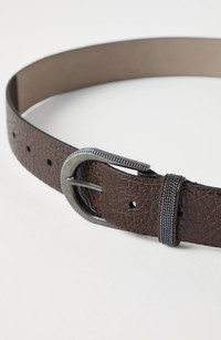 The manufacturing of the textured leather creates a soft, rich hand that highlights the material’s natural grain. All of the metal components are coated with precious materials that completely replace Nickel, enriching the excellence of every single detail. Belt height approx. 3.5 cm (1.38\")Nickel-free monili decoration