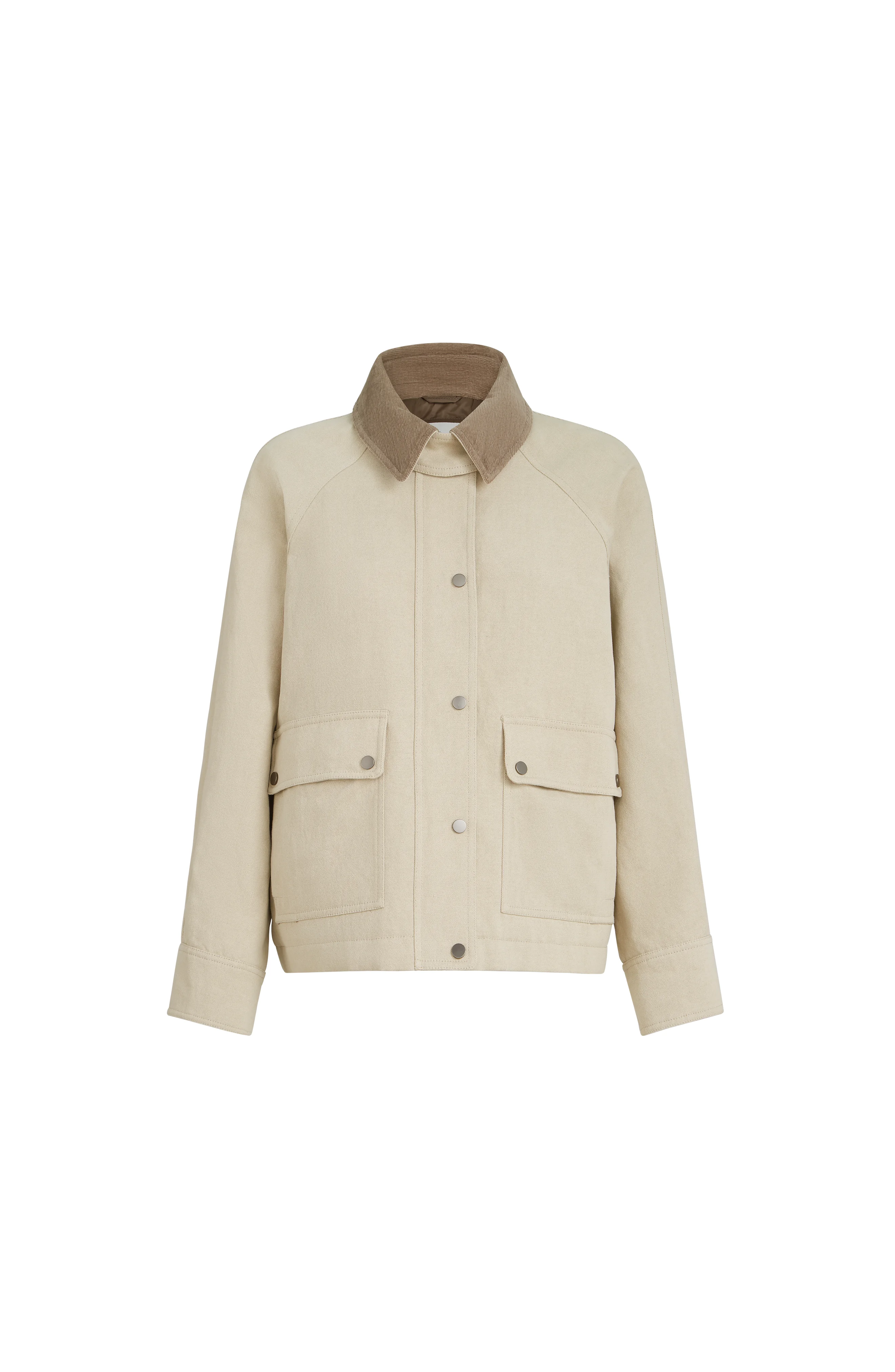 The cotton and linen canvas features a textured yet clean appearance. Very rich and crisp, it is a fabric with a distinctly masculine feel. The finish gives the material a soft hand. Double closure with zip and snapsCollar with insertSnaps at cuffsRegular sleeveTwo hand pockets: welt and patch with flap and buttonWater-resistant nylon liningThermore® padding