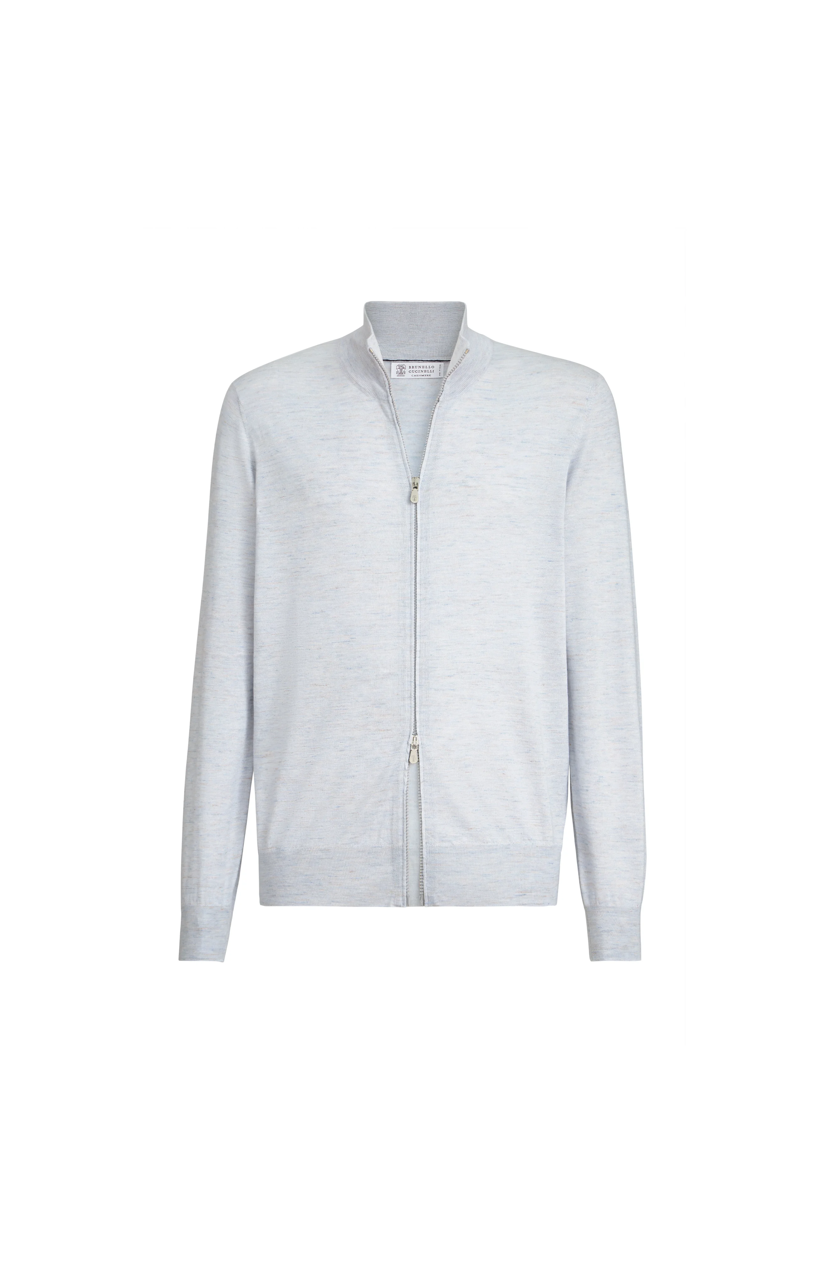 Single-ply knitting of the cashmere and silk yarn brings out the qualities of the natural fibers and provides lightness and comfort. The addition of linen enriches the season’s colors with the material’s characteristic irregular texture. The garment has a balanced weight that is particularly suited for the beginning of the season. Two-way zip closure High collar Rib knit cuffs and bottom band Plain stitch