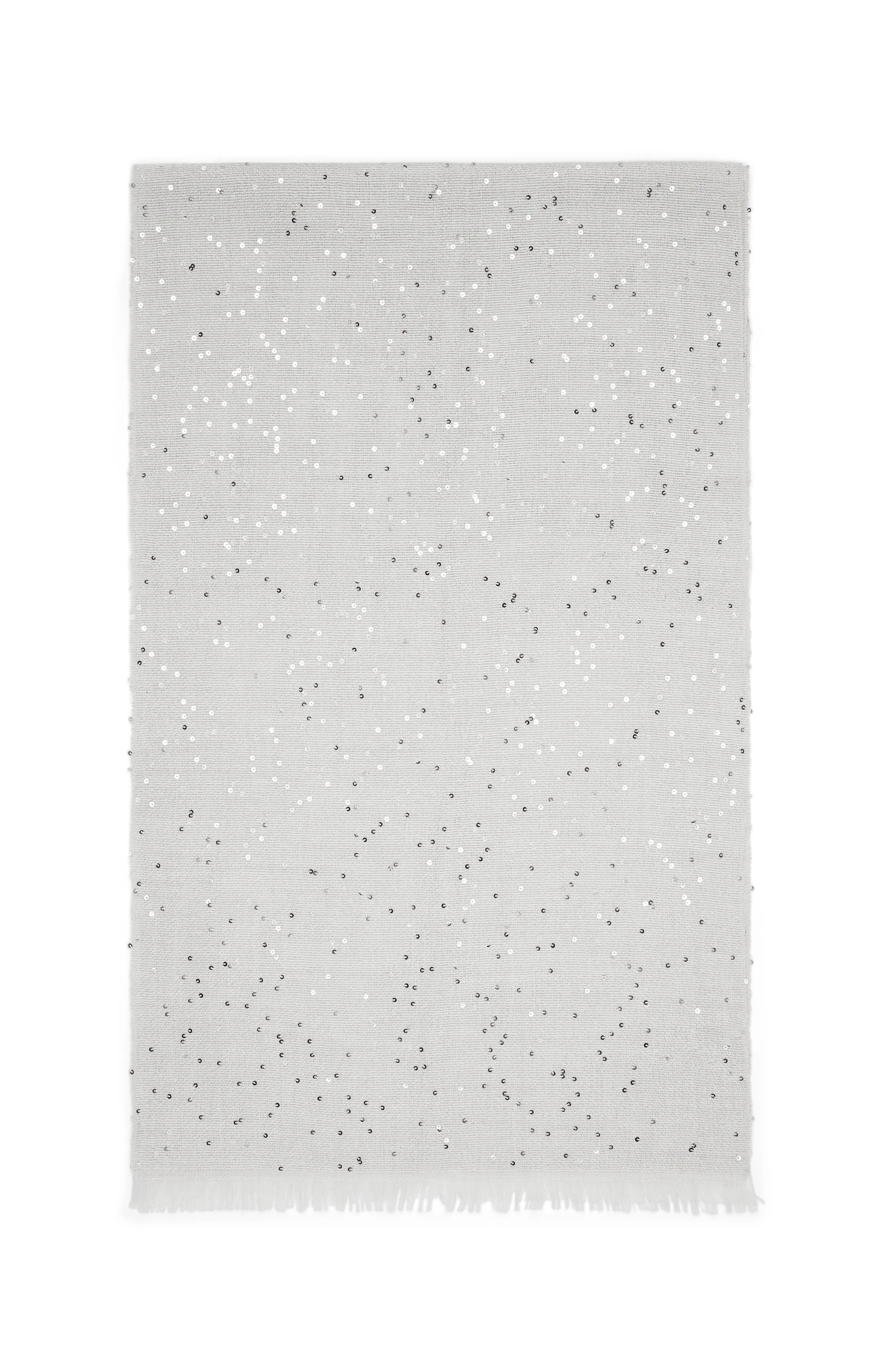 An iconic material of the Brunello Cucinelli collections, Diamond yarn combines the soft, enveloping effects of noble cashmere and silk fibers with sparkling reflections spread by small paillettes incorporated into the yarn. Scarf measures approx. 70 cm (27,56\") x 200 cm (78,74\")
