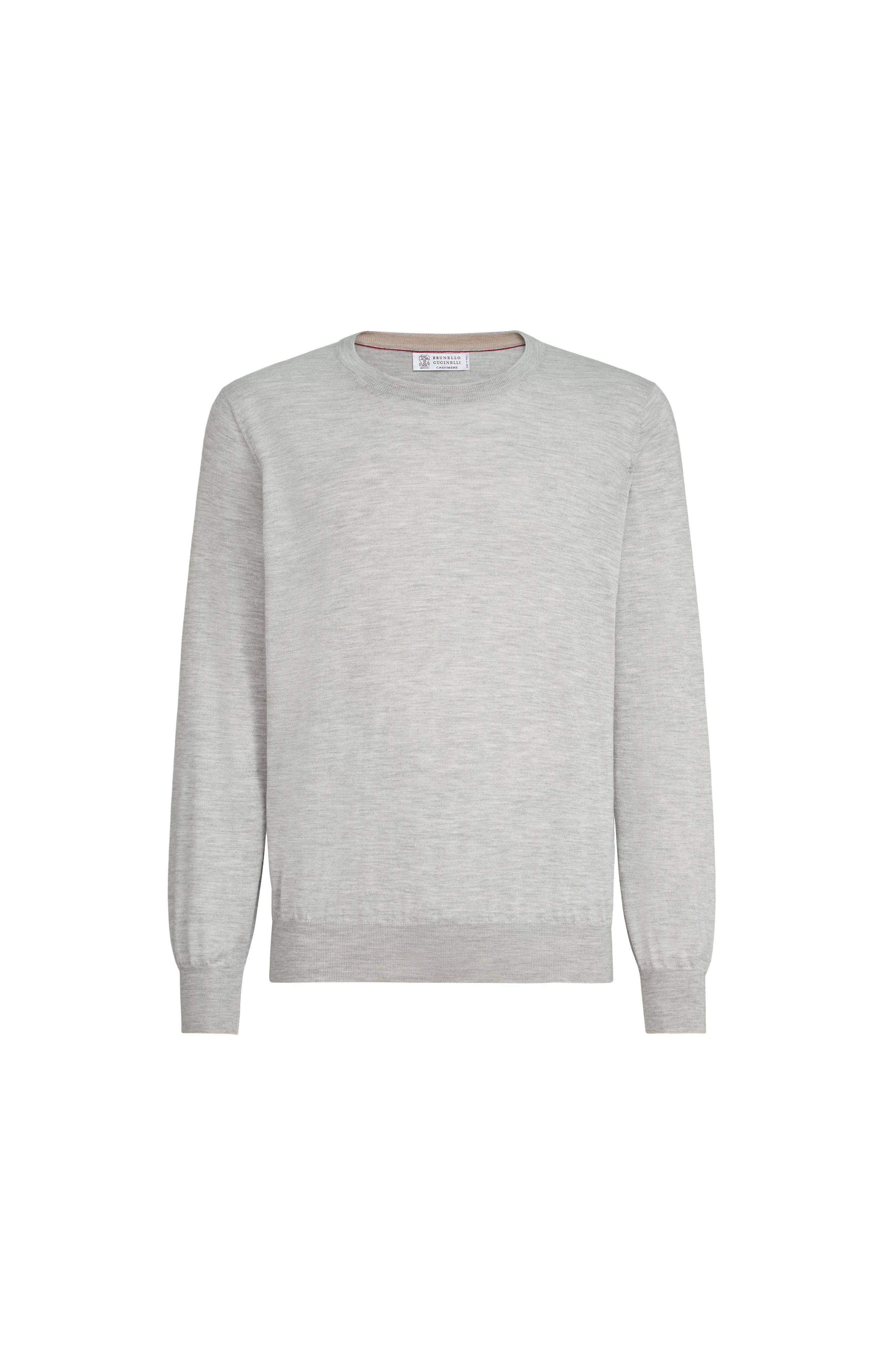 Single-ply manufacturing of the cashmere and silk yarn brings out the qualities of the natural fibers and provides lightness and comfort. The garment takes on a balanced weight which is very pleasant to wear. Crew-neck in rib knit Rib knit cuffs and bottom band Plain stitch