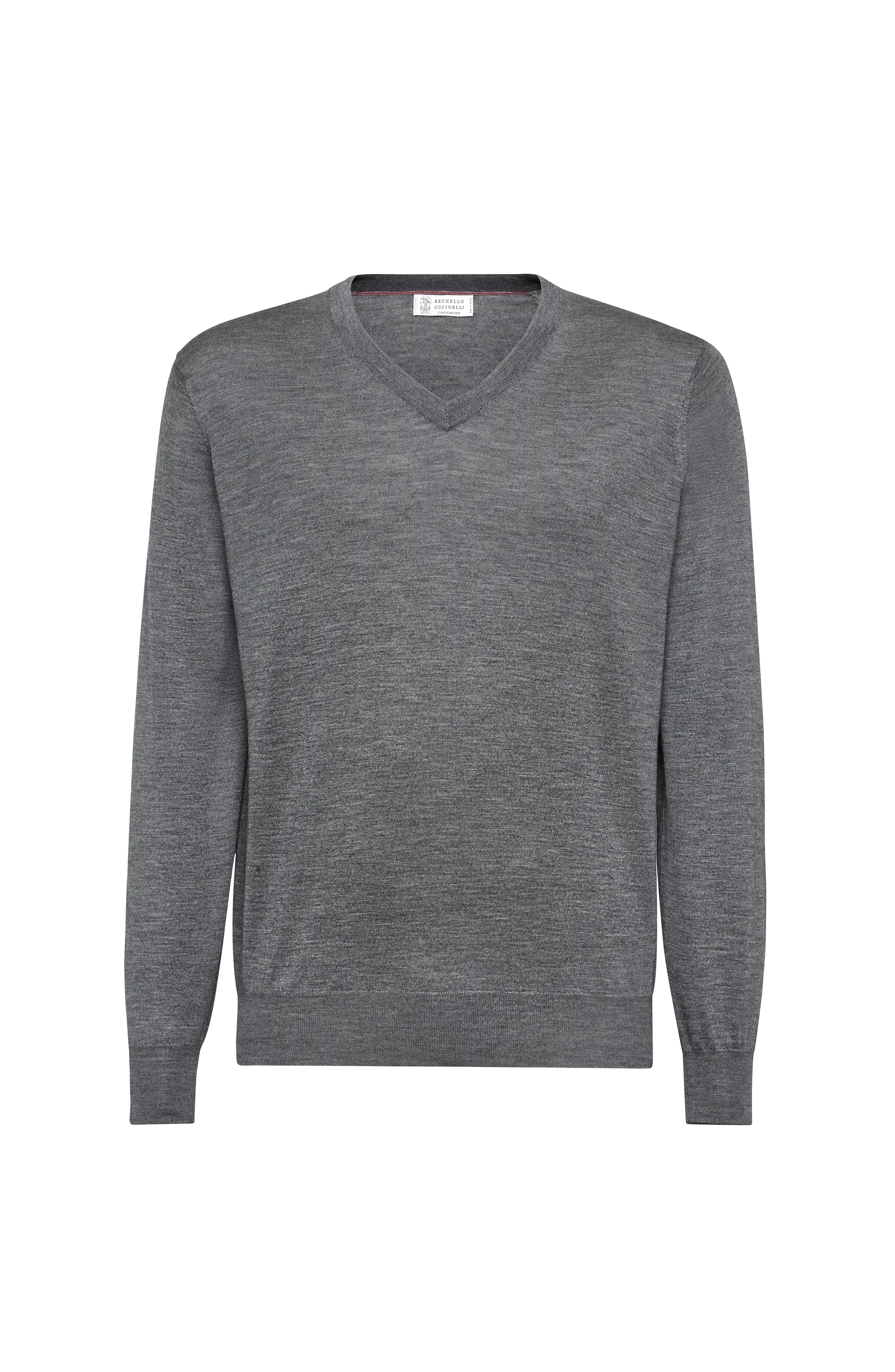 Single-ply manufacturing of the cashmere and silk yarn brings out the qualities of the natural fibers and provides lightness and comfort. The garment takes on a balanced weight which is very pleasant to wear. Rib knit V-neckRib knit cuffs and bottom bandPlain stitch