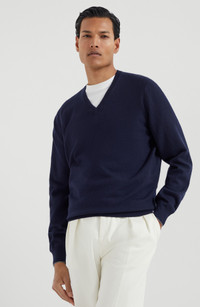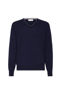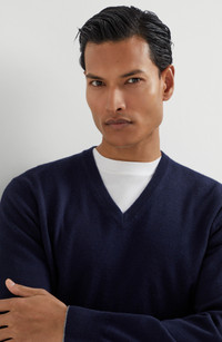 The noble cashmere fiber is characterized by an extreme fineness and also for its precious insulating qualities which guarantee warmth, providing coverage and lightness when worn. Rib knit V-neckRib knit cuffs and bottom bandPlain stitch