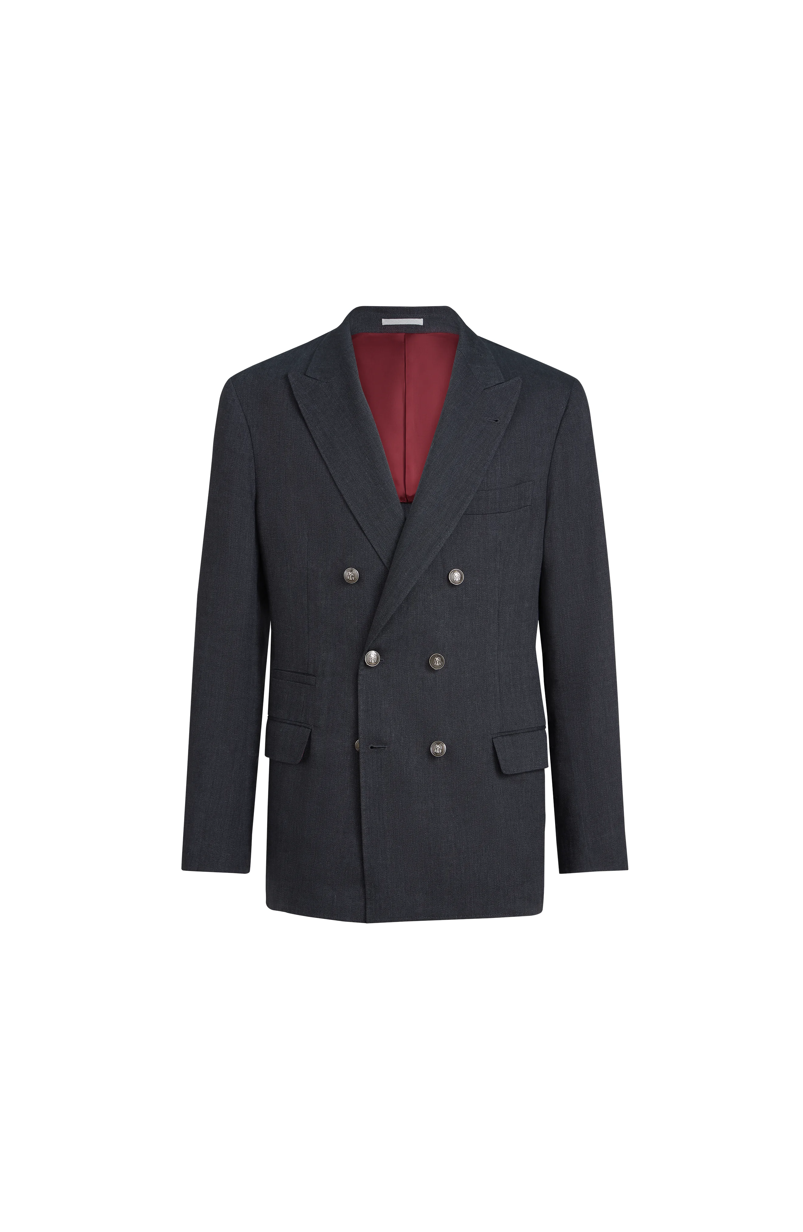 The mix of natural fibers increases the garment’s comfort and performance. The linen content enriches the chevron’s zig-zag pattern, while the virgin wool accentuates the fabric’s softness and wrinkle-free properties. The cupro half-lining completes the garment. 6 metal button closure Peak lapel Cuffs have four metal buttons and functional buttonholes Welt pockets with flap, ticket pocket and chest pocket Cupro half lining Two interior pockets with button closure and pen holder Double back vent Drop 7