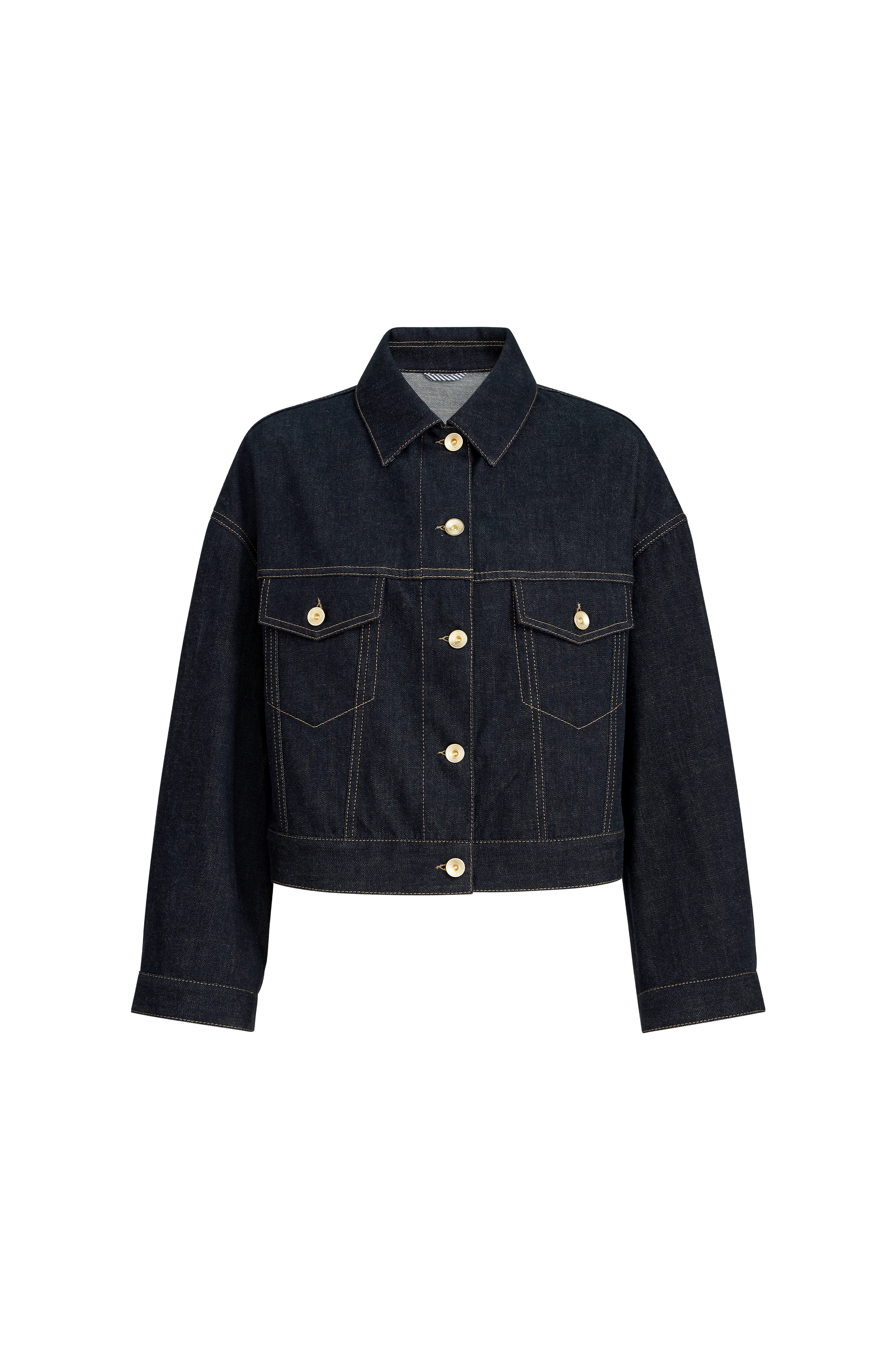 The pure cotton denim is characterized by a lightweight texture and a dark color that does not lighten after washing. Metal button closure Shirt-style collar Button cuffs Drop shoulder Upper pockets with flap and button Side buttons for fit adjustment Unlined Nickel-free monili decoration