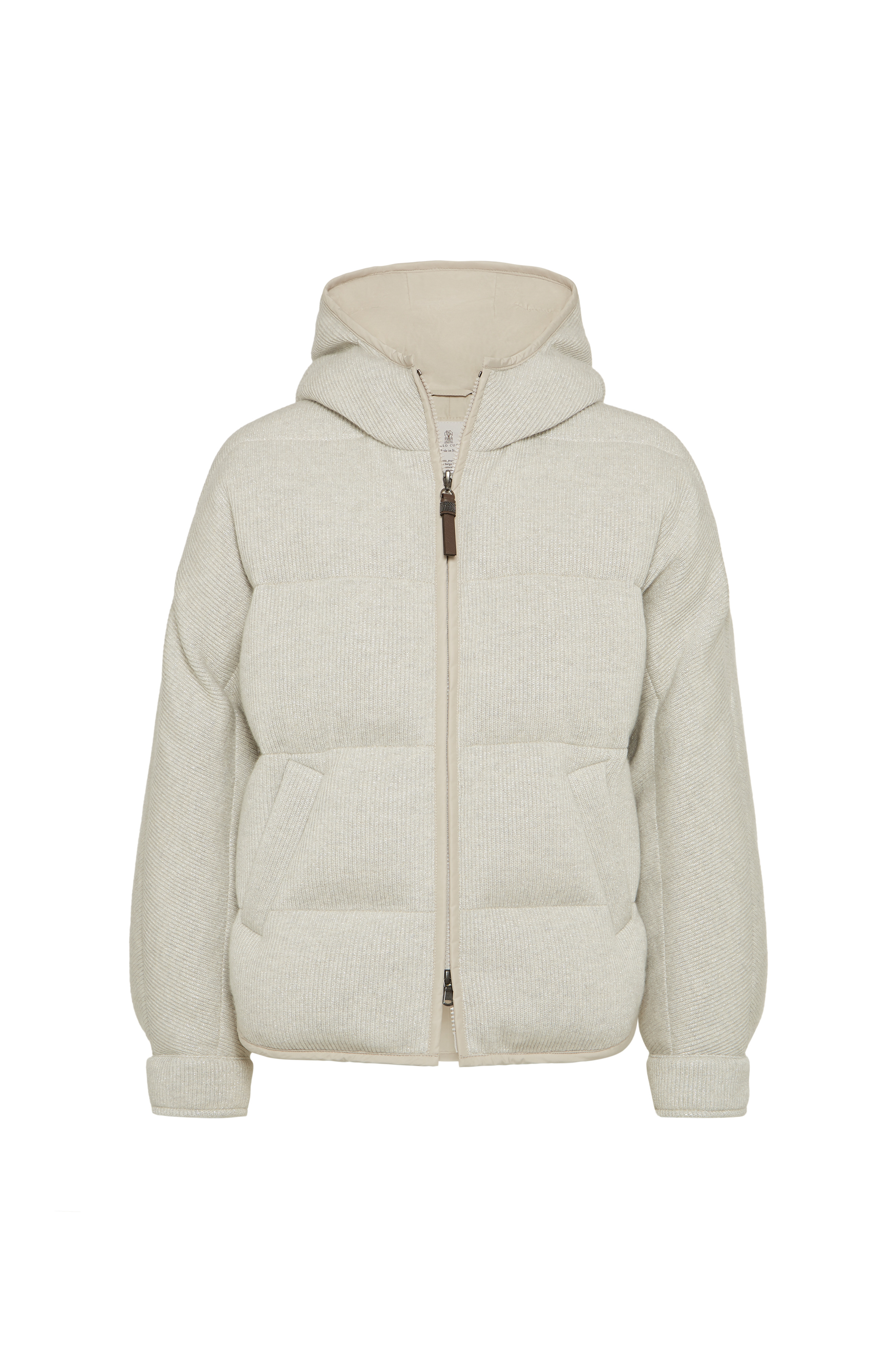 Created on a loom, the soft cashmere Sparkling yarn English ribbing combines the refined qualities of the natural fiber with a lame thread that enriches the texture with delicate metallic reflections. On the inside, soft goose down and feather fill provides this piece with added comfort. All of the goose down fill comes exclusively from European suppliers who are members of the EDFA (European Down and Feather Association), which guarantees animal and environmental welfare. Two-way zip closureWater-resistant nylon half liningHoodHand pocketsThermore® padding