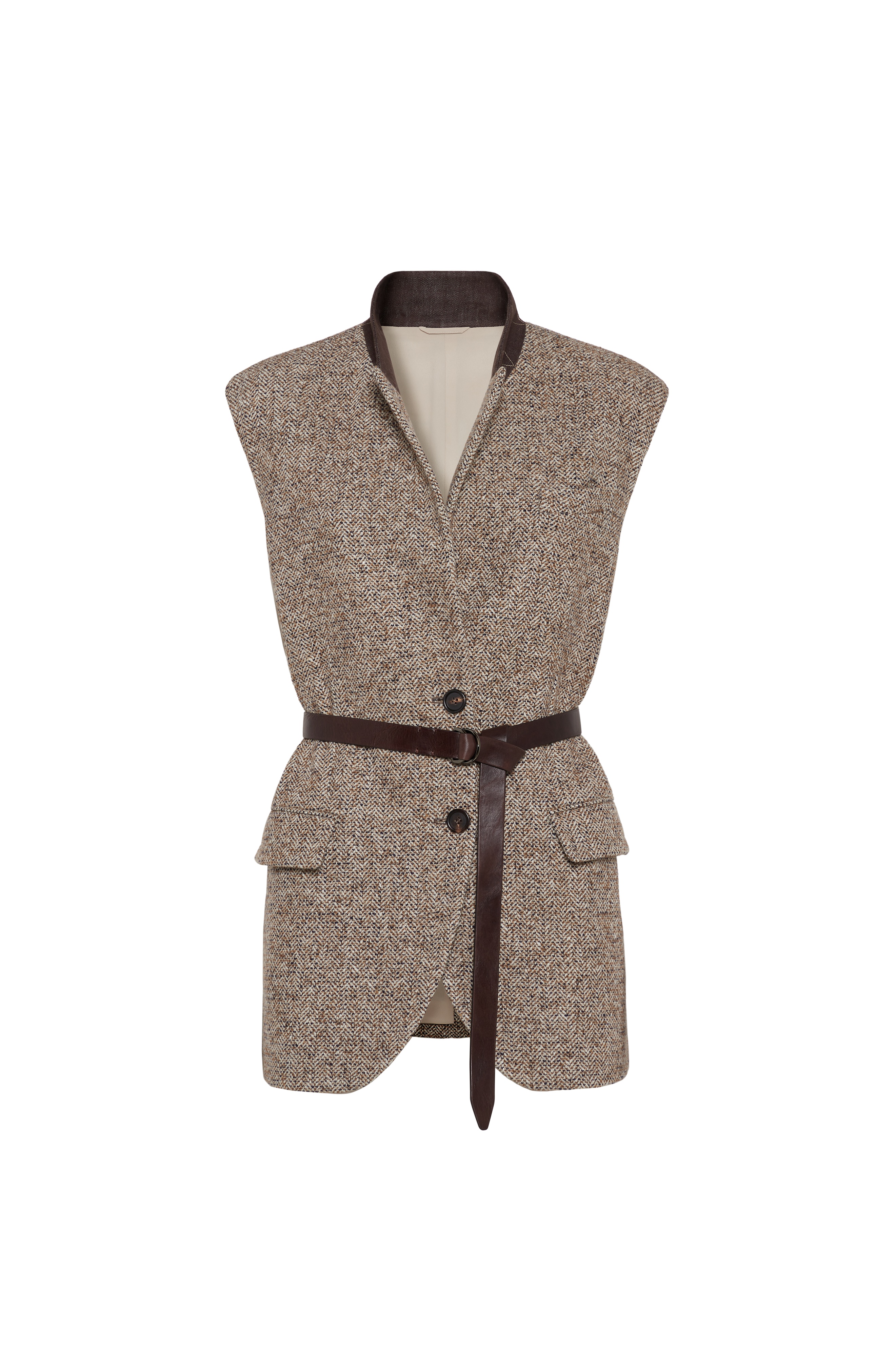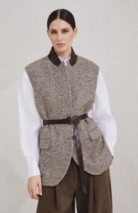 Flecked virgin wool and silk chevron vest with leather belt and monili