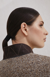 The flecked virgin wool and silk chevron stands out for its elegant herringbone design, enhanced by the refined irregularity of the flecked yarn. Soft and substantial, the hand reflects the warm texture of wool and the sophisticated sheen of silk. Horn button closureSilk-blend crepe liningPeak lapelWelt pockets with flap and chest pocketSingle back ventDetachable beltNickel-free monili decoration