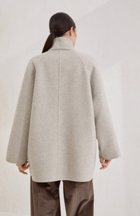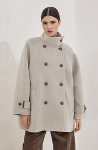 Hand-crafted pea coat in virgin wool and cashmere double cloth with shiny cuff details