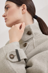 Special manufacturing creates the virgin wool and cashmere hand-finished fabric: two fabrics are simultaneously created on a loom using a construction with ultra fine threads that unites them along the entire surface. The material is thin, lightweight, and, at the same time, soft and cozy. Metal button closureUnlinedCuffs with metal buttonHand pocketsNickel-free monili decoration