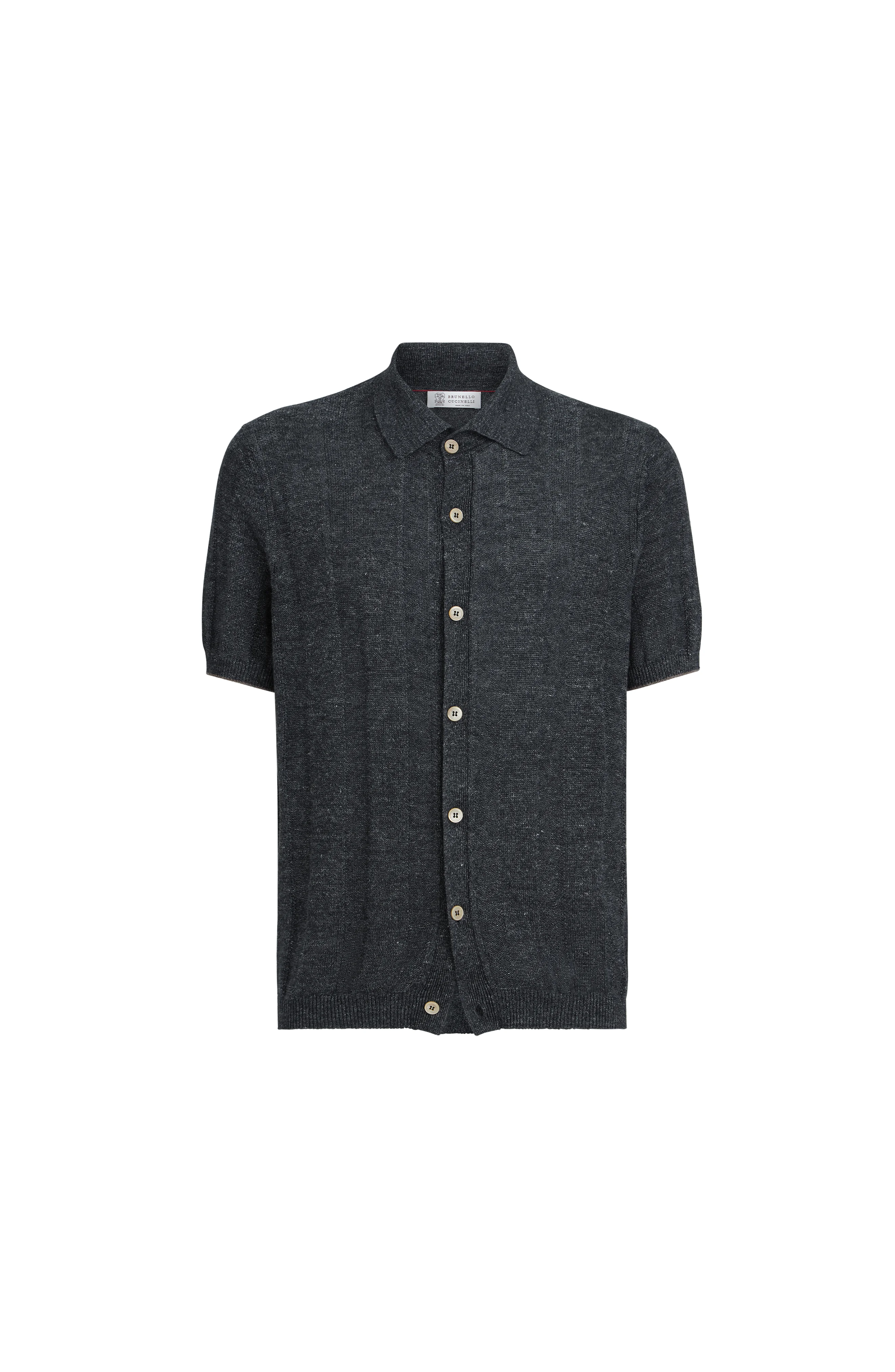 The combination of natural linen and cotton fibers creates a fine yarn with a slightly irregular thickness. Lightweight and pleasant to wear, the texture is enriched by the slubbed characteristic of the linen, which gives the garment a sophisticated and fresh character. Mother of pearl button closure Shirt-style collar Regular shoulder Rib knit cuffs and bottom band Rib knit