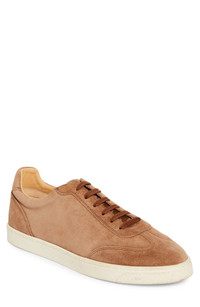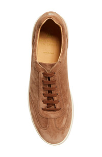 A golden crest brands the counter of a low-top sneaker fashioned in Solomeo, Italy from velvety suede. Lace-up style Leather upper and lining/rubber sole Made in Italy Designer Shoes