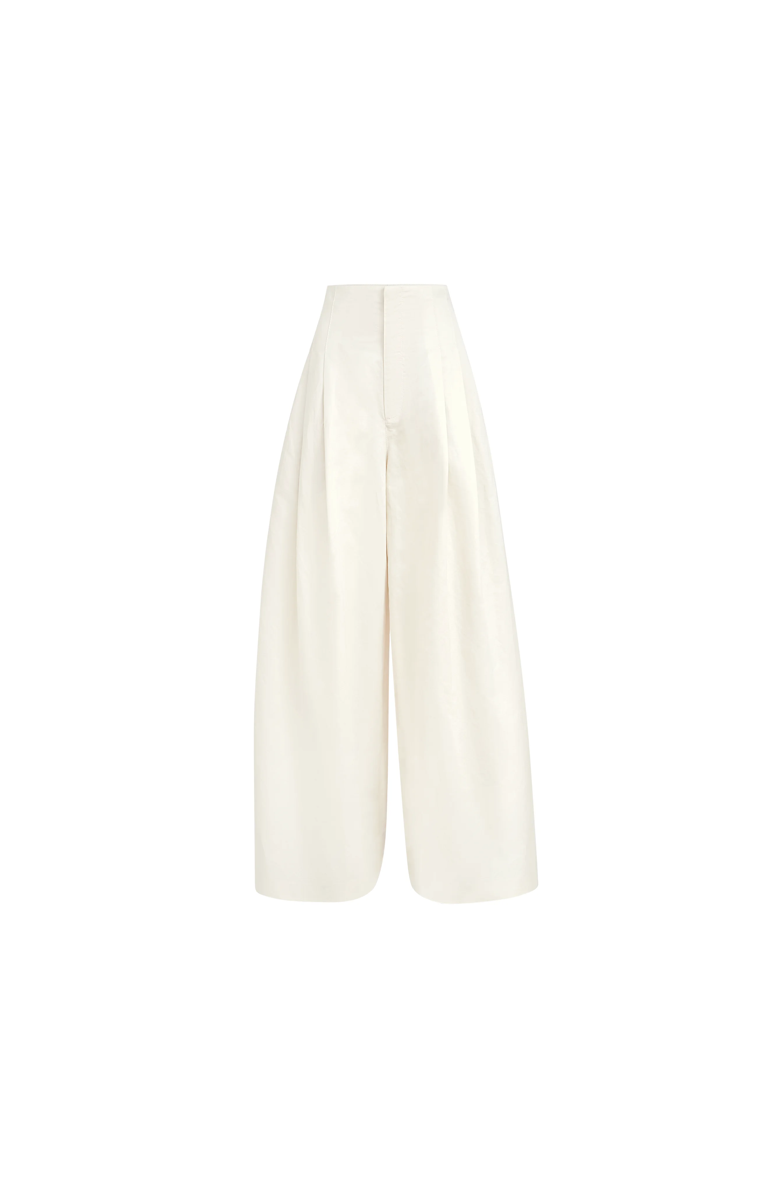 Cotton and ramie twill is a fabric with a compact, dry and crisp hand. It blends refined cotton and ramie fibers, a natural and sustainable textile fiber made from the bark of the Boehmeria Nivea plant. Zip closure with metal hook and backing buttonVertical front pocketsDouble pleatBack patch pocketsPlain hem