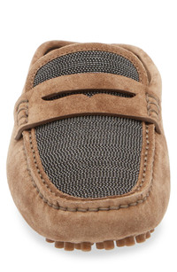 The designer's signature monili beading gleams at the vamp of an elevated driving loafer-mule crafted in Italy from richly grained suede. Leather upper and lining/rubber sole Made in Italy Designer Shoes