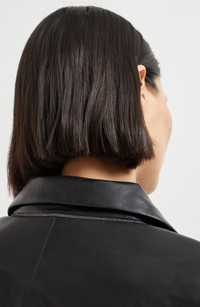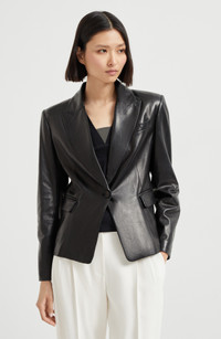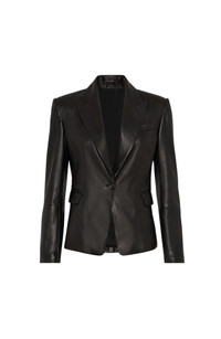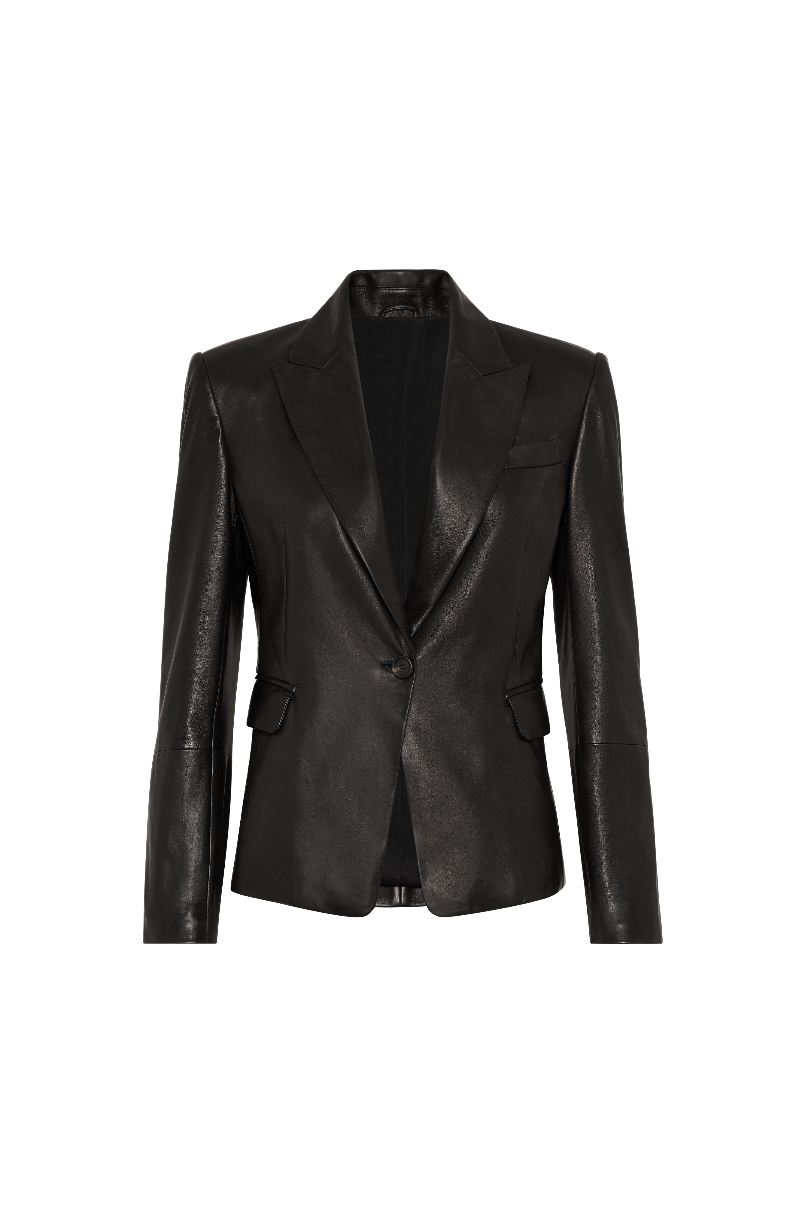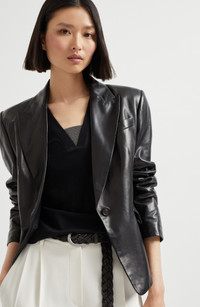 Nappa is a very soft, compact and lightweight leather characterized by a very fine grain and a semi-polished look. The dye in the season’s colors spreads an intense, even hue. Horn button closureSilk-blend crepe liningWelt pockets with flap and chest pocketCuffs have four horn buttonsPeak lapelNickel-free monili decoration