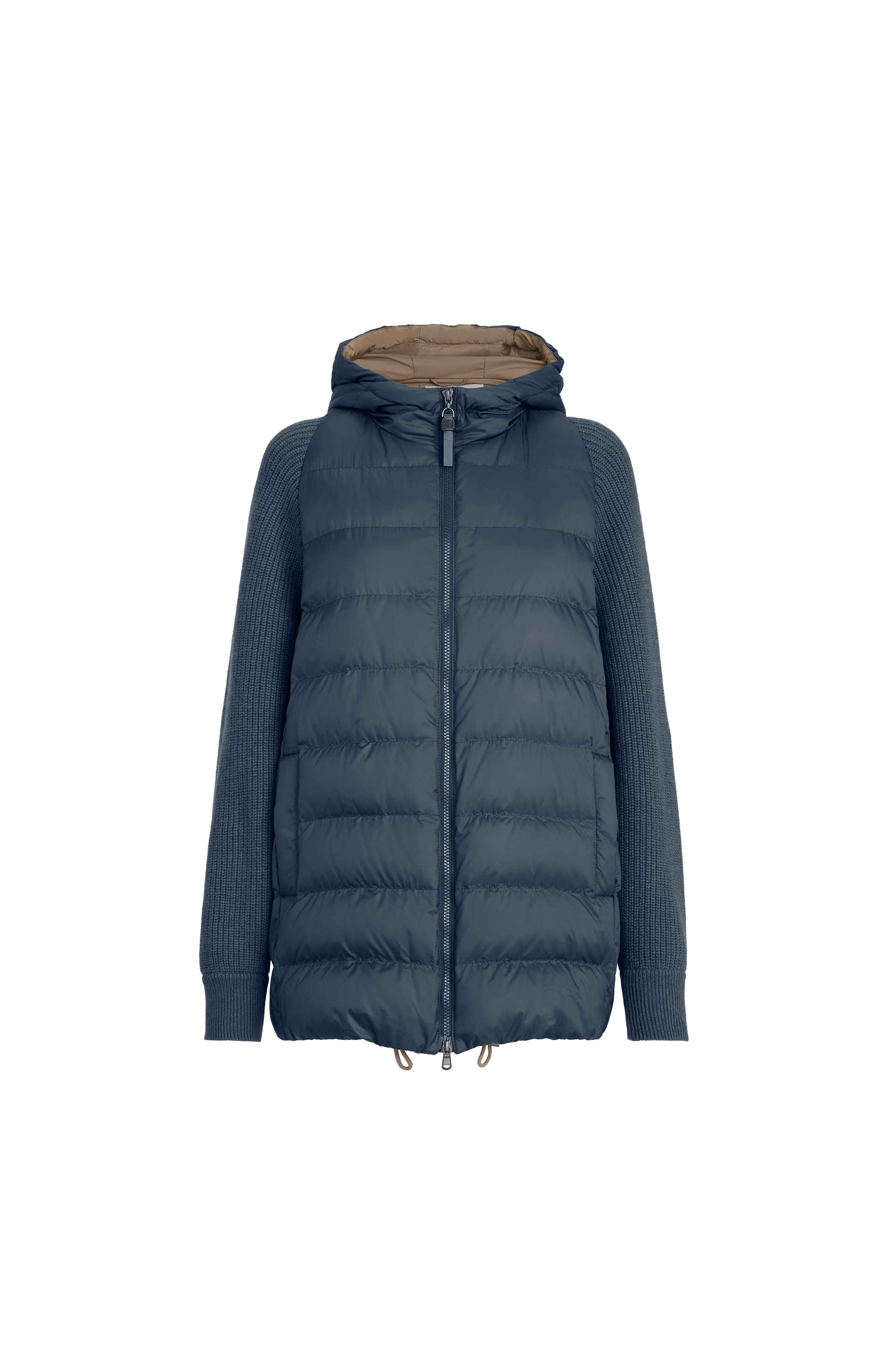 Water-resistant matte nylon hooded down jacket with virgin wool, cashmere and silk knit sleeves and