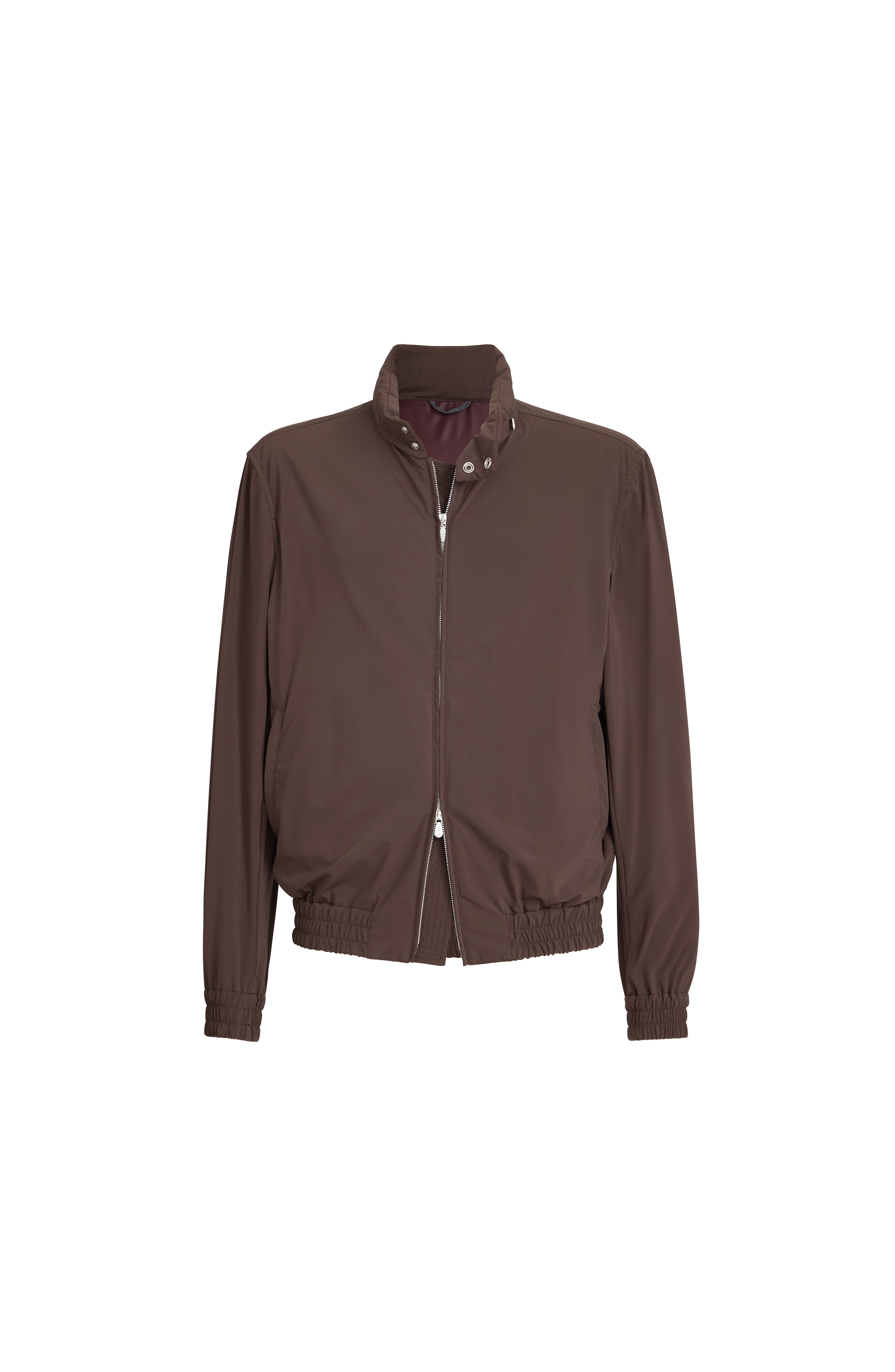 Nylon is a lightweight fabric, equipped with a thin inner membrane that heightens weather-resistance while maintaining excellent breathability. Two-way zip closure Collar may be worn raised Pull-out hood Elastic cuffs Hand pockets with zipper Elasticized hem Unlined Two interior pockets with button closure and pen holder