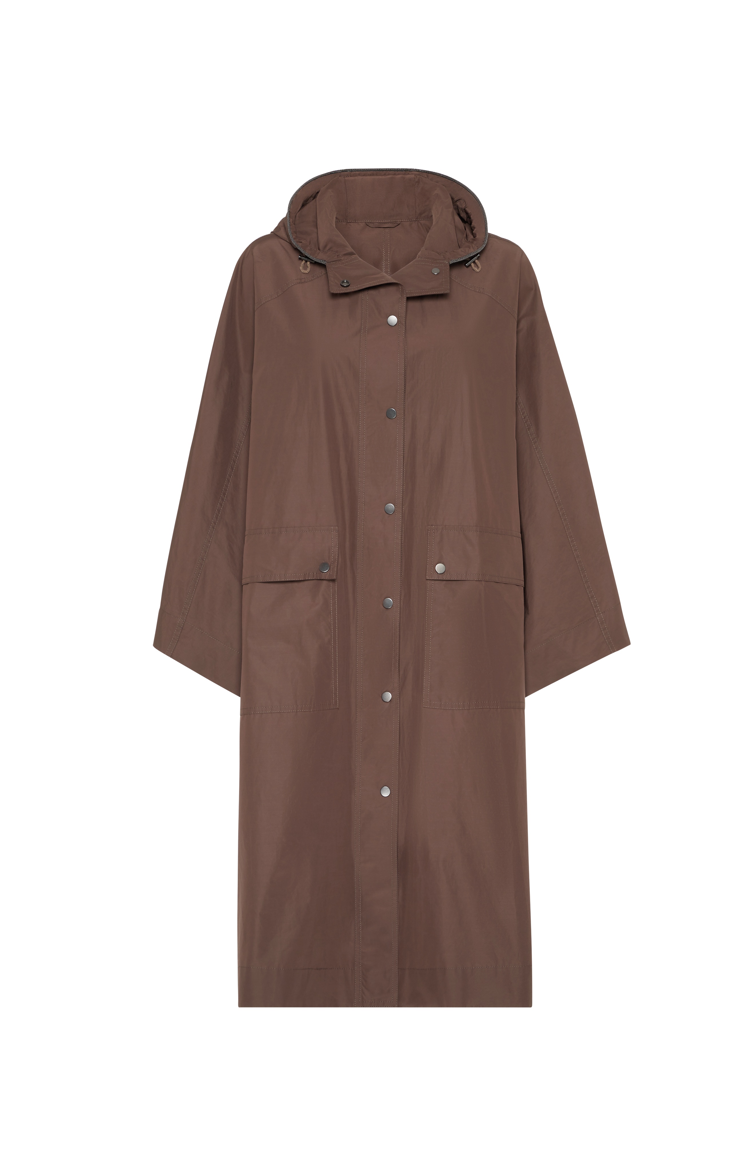 Water-resistant taffeta is a fabric that combines cotton yarn with a synthetic fiber to give the texture a crisp, slightly shimmering appearance. The finish helps to protect the material from the slightest contact with water. Snap closure Unlined Adjustable drawstring hood Patch hand pockets with flap and button Side buttons for fit adjustment Nickel-free monili decoration