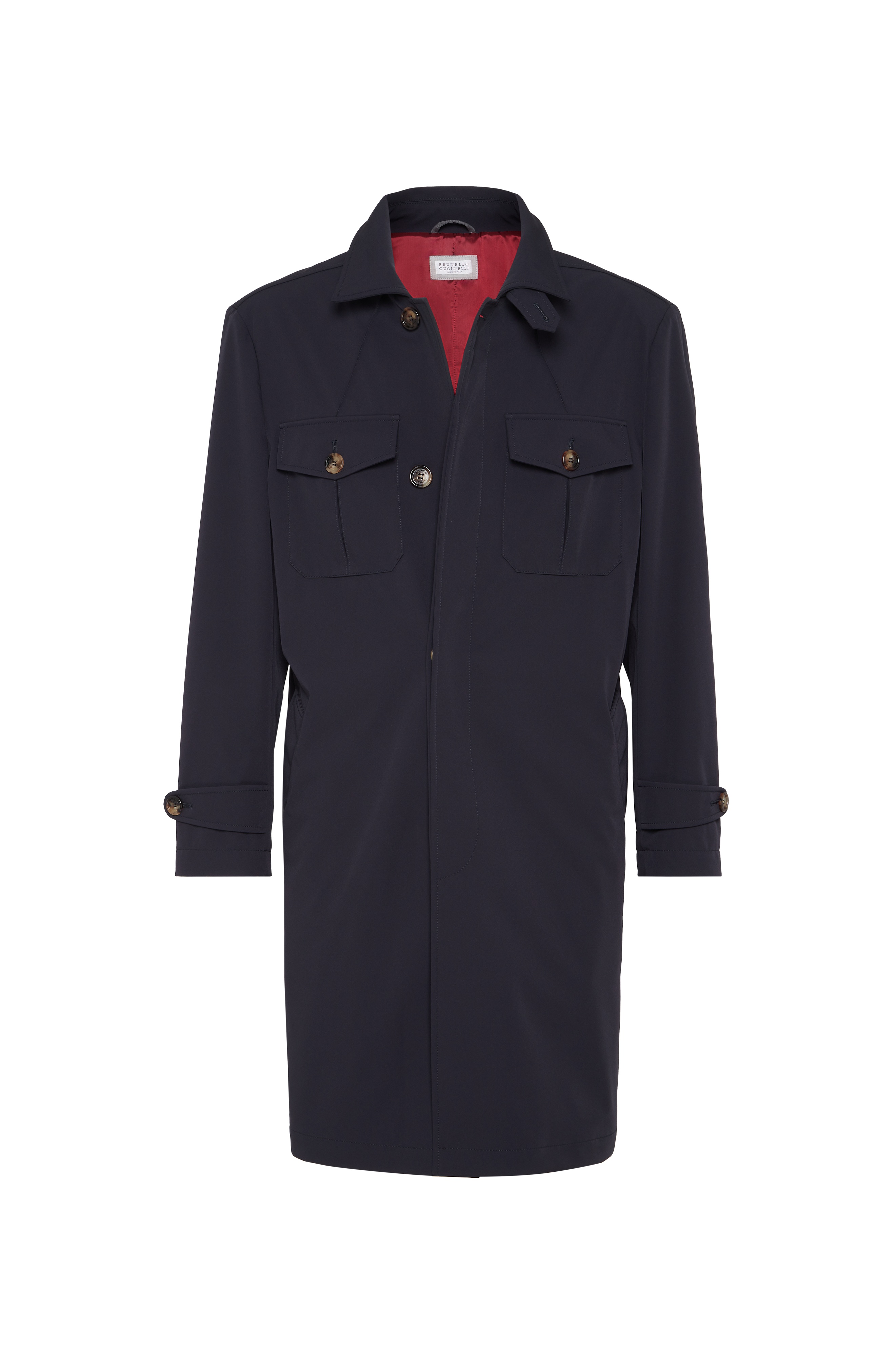 Nylon is a lightweight fabric equipped with a thin inner membrane that improves weather-resistance without compromising breathability. A small percentage of elastic fiber provides the garment with added comfort. Horn button closure Collar may be worn raised Upper patch pockets with flap and button Vertical hand pockets Adjustable button cuffs Cupro lining Two interior pockets with button closure and pen holder Storm shield Single back slit with buttons