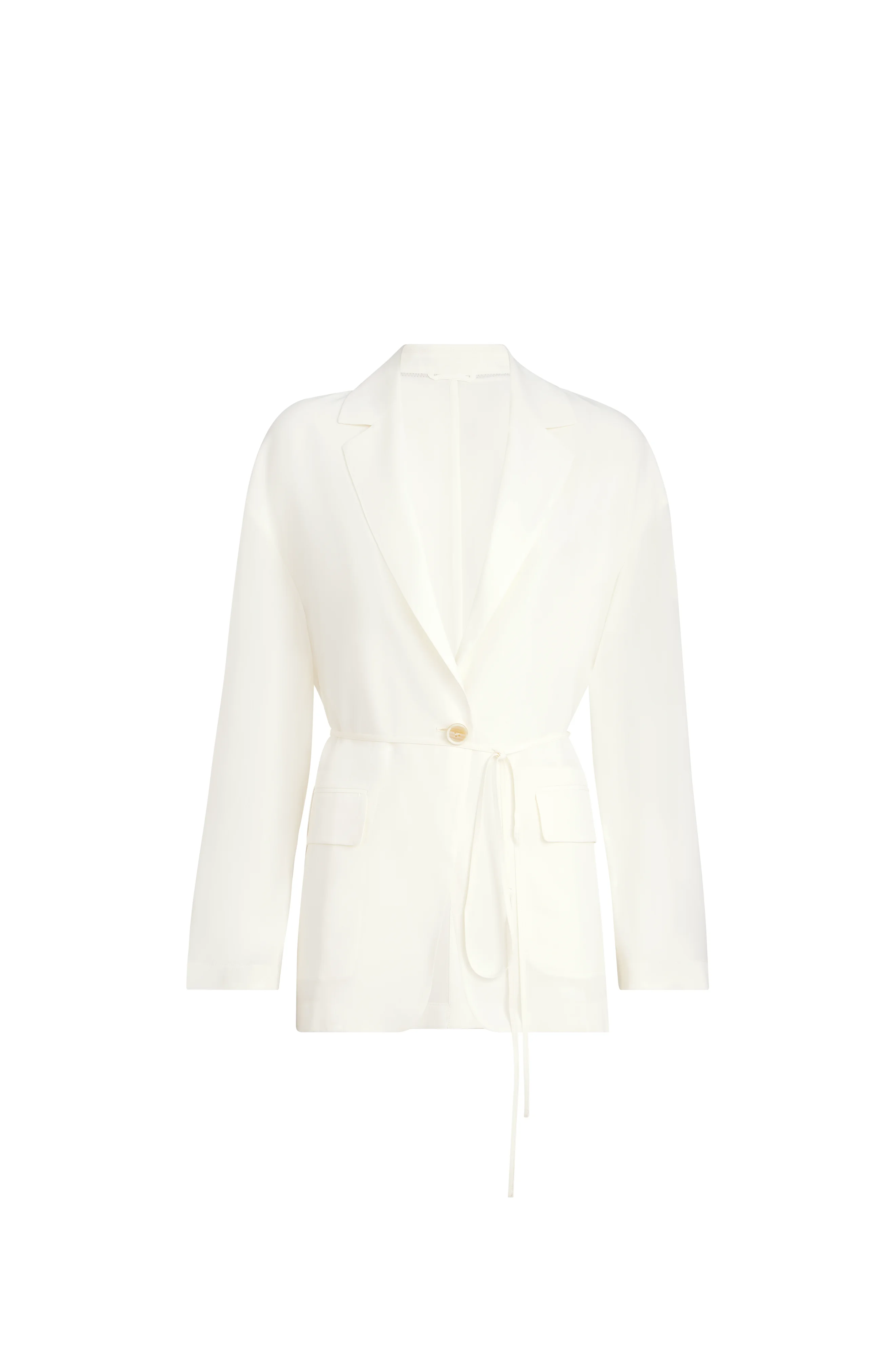 Pure silk sable crepe is an ultra lightweight and precious fabric. Special twisting of the threads makes the texture slightly crushed and extremely fluid. The dye on the fabric disperses the dark colors of the season with the characteristic matte effect of silks. Horn button closure Notched lapel Hand pockets with flap Single back vent Detachable tie belt Nickel-free monili decoration