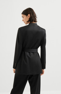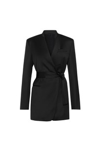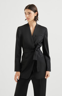 Virgin wool stretch satin is a fabric with inherent elegance, characterized by a smooth, silky hand. Resistant and warm, it is completed by a small percentage of elastic fiber which increases the garment’s comfort. Horn button closureSilk-blend crepe liningWelt pockets and chest pocketCuffs have four horn buttonsDetachable tie beltNickel-free monili decoration