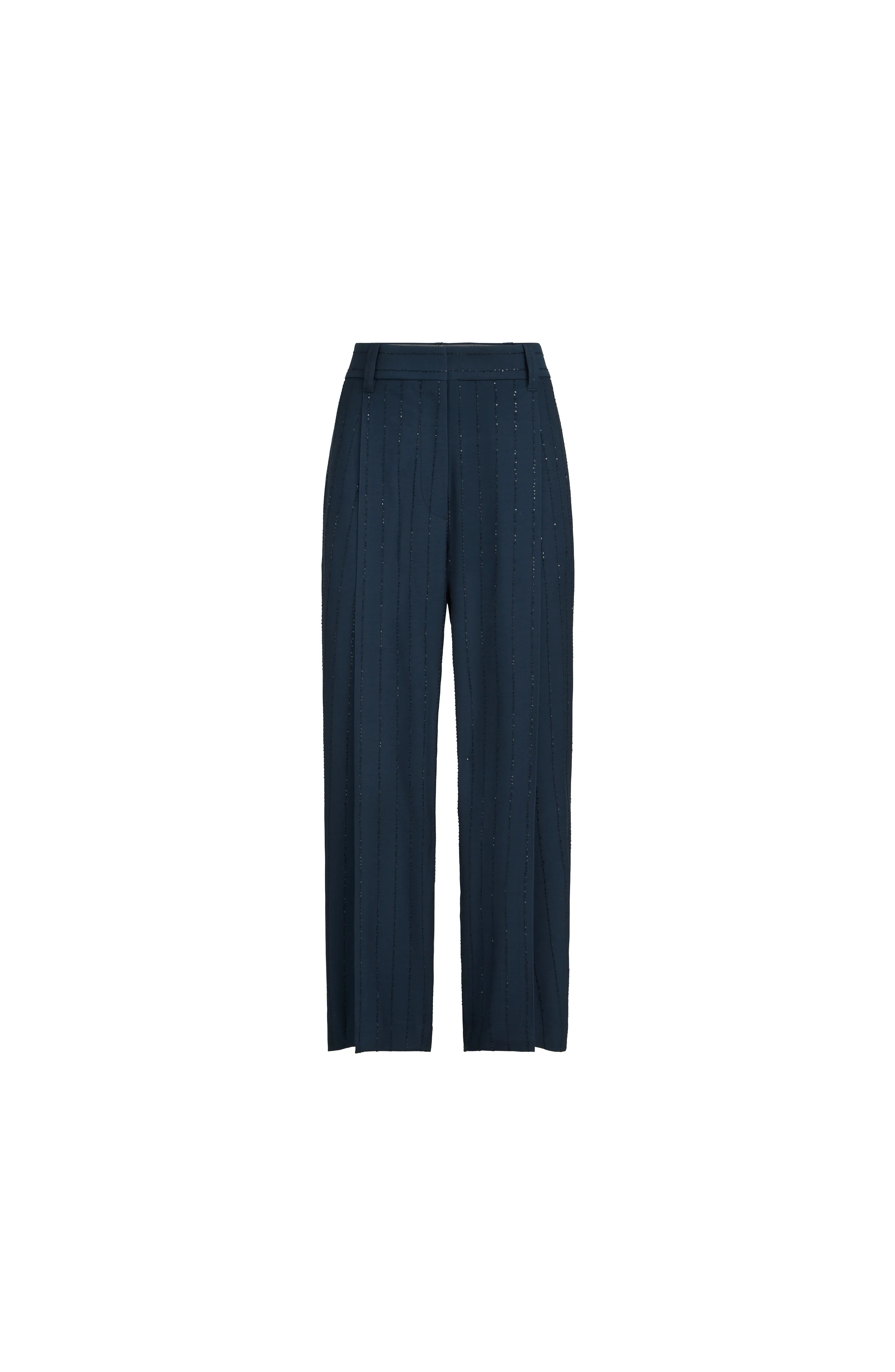 The lightweight viscose-blend twill has a very soft, fluid hand. Zip closure with metal hooks and backing button Slanted front pockets Pleat Back welt pockets Plain hem Nickel-free monili decoration