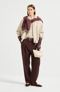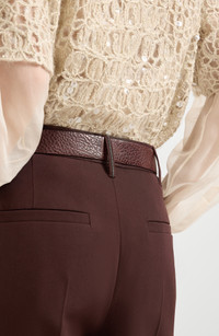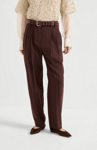 The gabardine combines the qualities of the natural virgin wool and cotton fibers to create a fabric that is both compact and lightweight, with a smooth texture and soft hand to guarantee pleasant comfort when worn. Zip closure with metal hooks and backing buttonSlanted front pocketsDouble pleatBack welt pocketsUnlinedNickel-free monili decoration