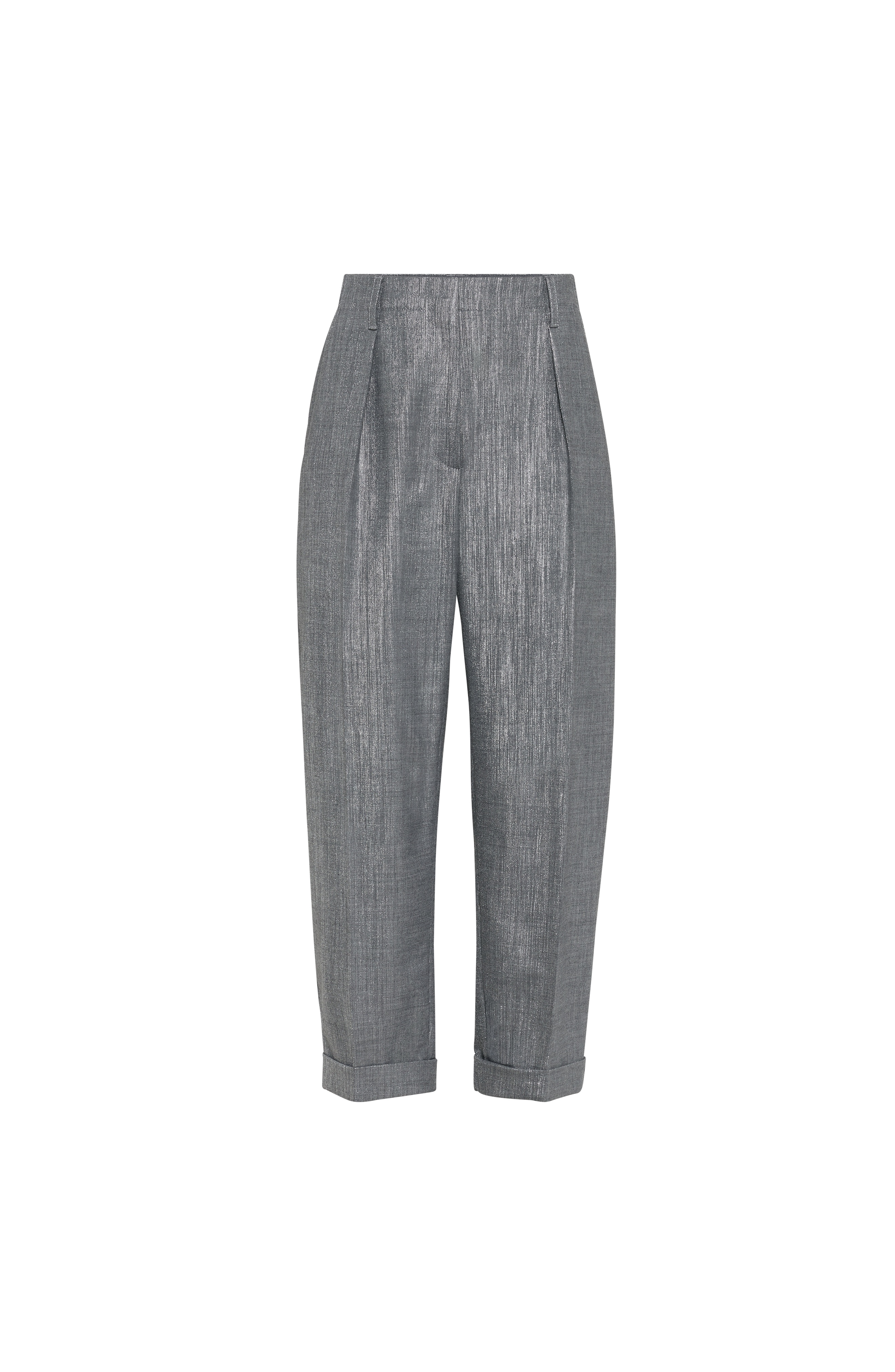 The sheen of the lame thread enhances the feminine allure of the virgin wool twill, characterized by the typical diagonal structure. The small percentage of synthetic fiber makes the garment extraordinarily comfortable to wear. Zip closure with button, metal hooks and backing buttonFront pocketsBack welt pocketsPleatCuffed hem