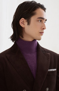 Fine two-ply cashmere fiber lends the perfect weight to the garment and guarantees comfort. High collar in rib knit Rib knit cuffs and bottom band Plain stitch