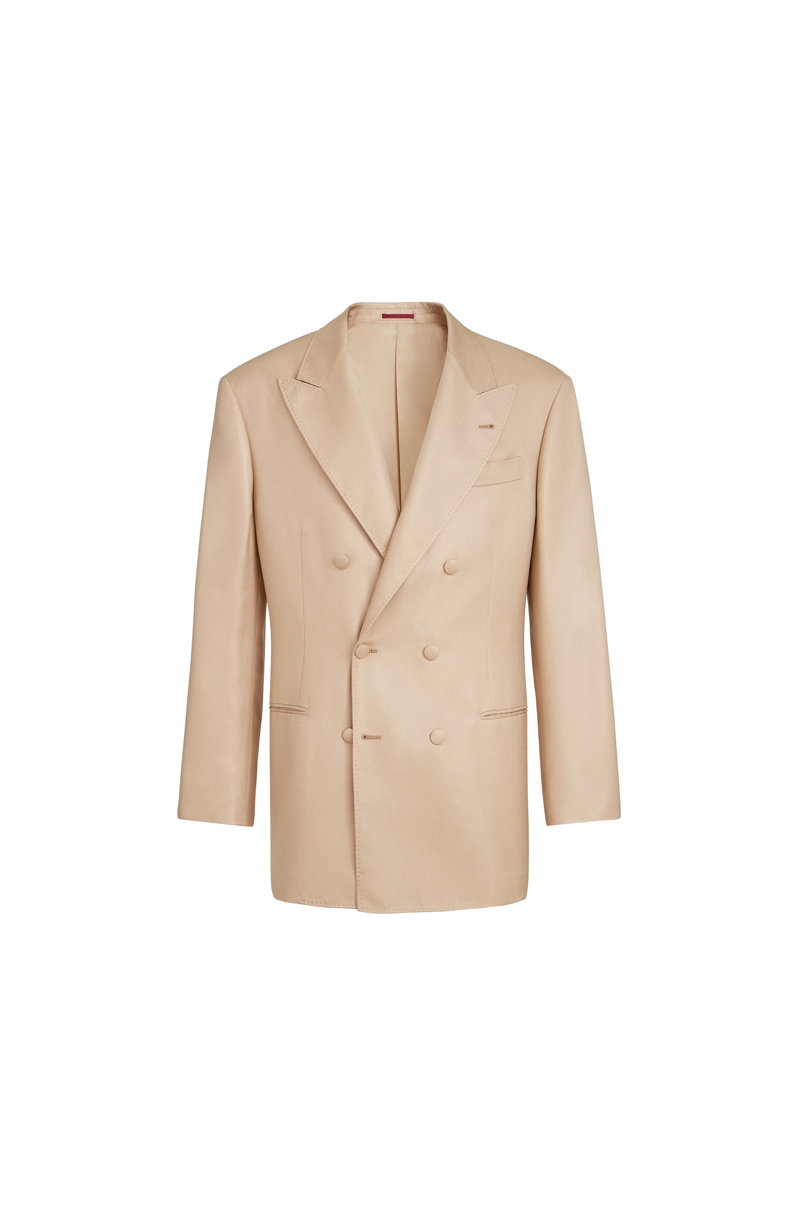 The compact structure of the diagonal twill weave enhances the natural sheen of the silk fibers with a distinct texture with a light, smooth feel. The cupro lining provides added comfort. Six button fastening Peak lapel Buttons at cuffs Welt pockets and chest pocket Cupro lining Two interior pockets with button closure and pen holder Double back vent Drop 7