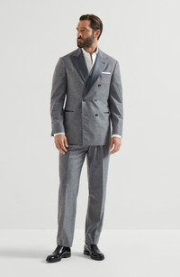 The blend of cashmere and silk fibers gives the flannel a soft, luminous texture, enhancing the season’s colors. The lightness of the fabric, complemented by a cupro lining, ensures a nice, comfortable fit. *Blazer* 6 horn button closure Peak lapel Welt pockets and chest pocket Two interior pockets with button closure and pen holder Cuffs have four horn buttons and functional buttonholes Cupro lining Double back vent Drop 7 *Trousers* Zip closure with button, metal hook and backing button Slanted front pockets Pleat Buckles on the side Back welt pockets Cupro lining to knee