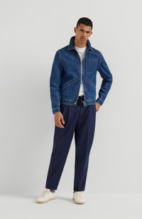 The soft, lightweight pure wool flannel enhances the noble qualities of the natural fiber, while the twill weave showcases the fabric’s characteristic diagonal texture. The knee-length lining provides added comfort. Zipper closure with metal hook, inner-button and drawstring Slanted front pockets Double pleat Back welt pockets Plain hem Lining to knee Leisure fit: the rise and seat are soft and the proportions of the leg are tapered