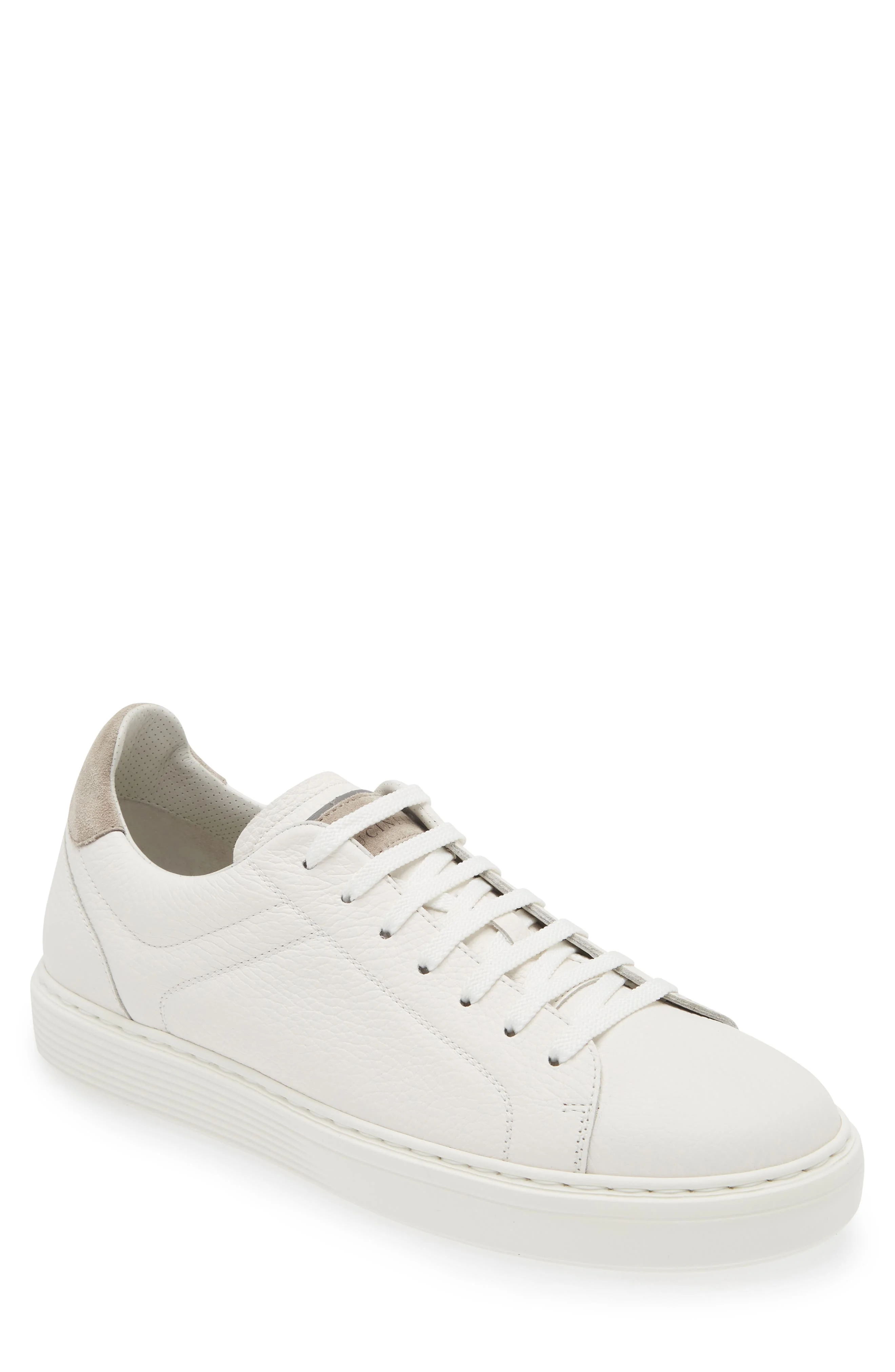 A lightweight rubber sole offers cushiony comfort as well as color contrast to the grained calfskin-leather upper of this refined Italian-crafted sneaker. Lace-up style Leather upper and lining/rubber sole Made in Italy Designer Shoes