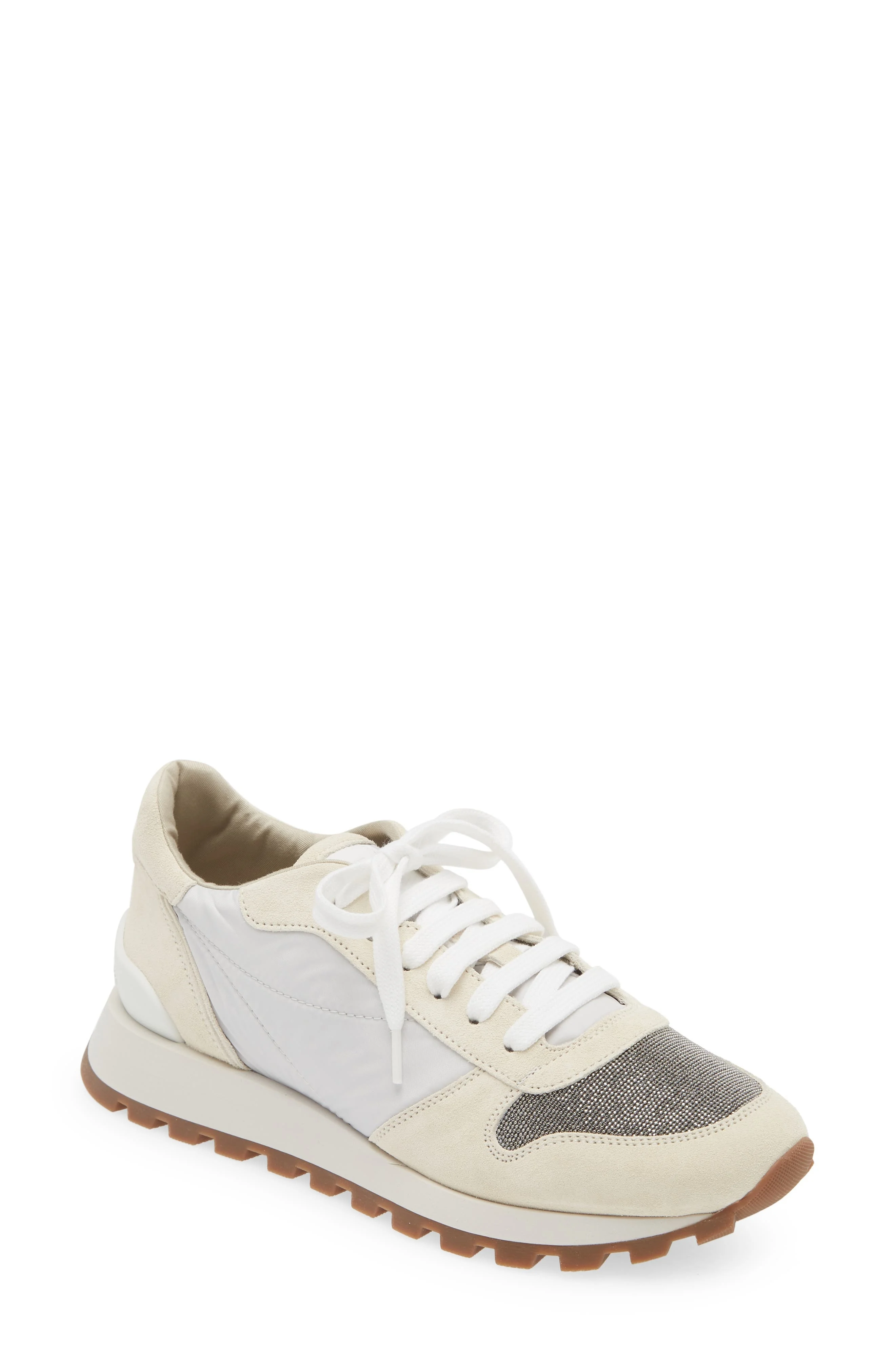 Signature monili trim adds an unexpected flash of glamour to this mixed-media sneaker set on a toothy sole. Lace-up style Removable insole Leather and textile upper/textile lining/rubber sole Made in Italy Designer Shoes