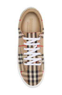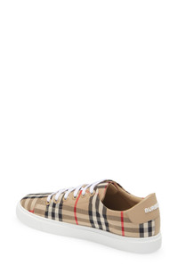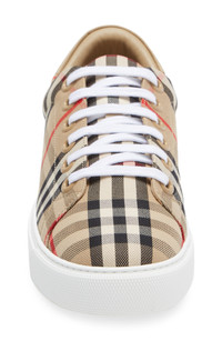 Burberry's Vintage check-first introduced in the '20s-brings heritage style to this low-top sneaker with a raised logo standing out at the leather heel tab. 3/4" platform (size 38.5) Lace-up style Removable Insole Textile and leather upper/leather lining/rubber sole Made in Italy Women's Designer Shoes