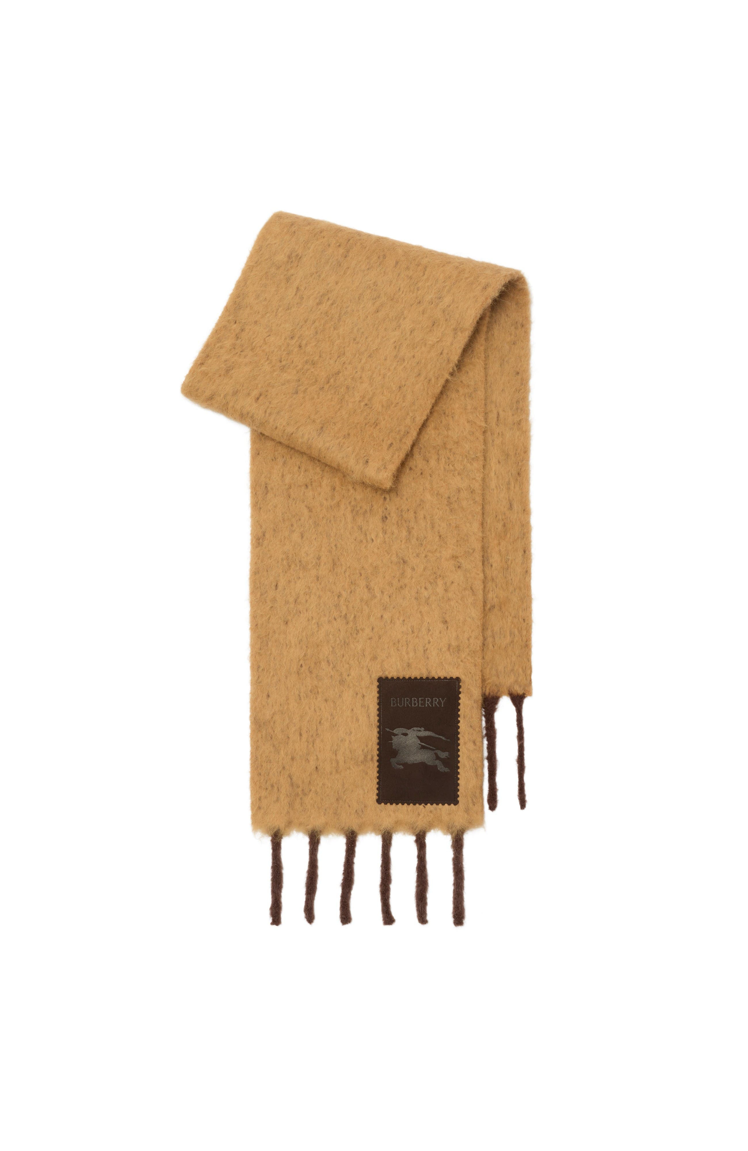 A scarf made in Italy from a brushed alpaca wool blend, edged with chunky twisted fringing. The style features an appliqued suede patch, subtly embossed with our Equestrian Knight Design.||Rectangular|Fringing at both ends|Equestrian Knight Design label 200 x 28cm/78.7 x 11in 91% alpaca wool, 9% polyamide Spot clean Made in Italy