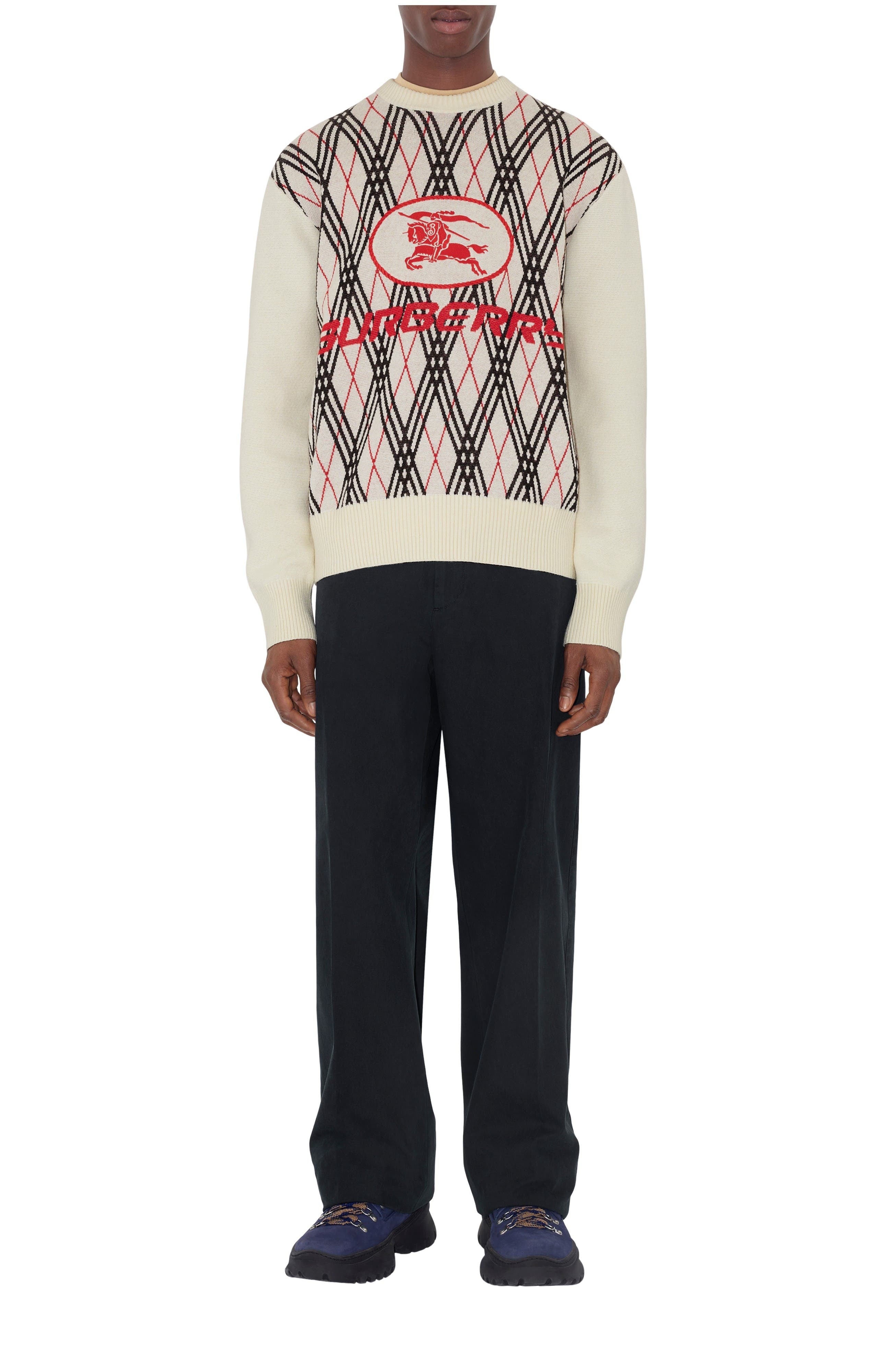 A sweater made in Italy from a lightweight wool blend, jacquard-knitted with the Burberry Check in an argyle pattern. Cut to a relaxed fit, the crew-neck style is finished with our logo and an embroidered Knight stamp – an archival motif from the 1980s. ||Rib-knit trims|Embroidered Equestrian Knight Design at front Relaxed fit: a looser cut than our regular fit. Length: 68.5cm/27in (size UK M) Model’s height: 184cm/6ft. Model wears size UK M 62% acrylic, 27% wool, 11% polyamide Trims: 100% polyester; 60% acrylic, 26% wool, 13% polyamide, 1% elastane Specialist dry clean Made in Italy