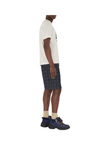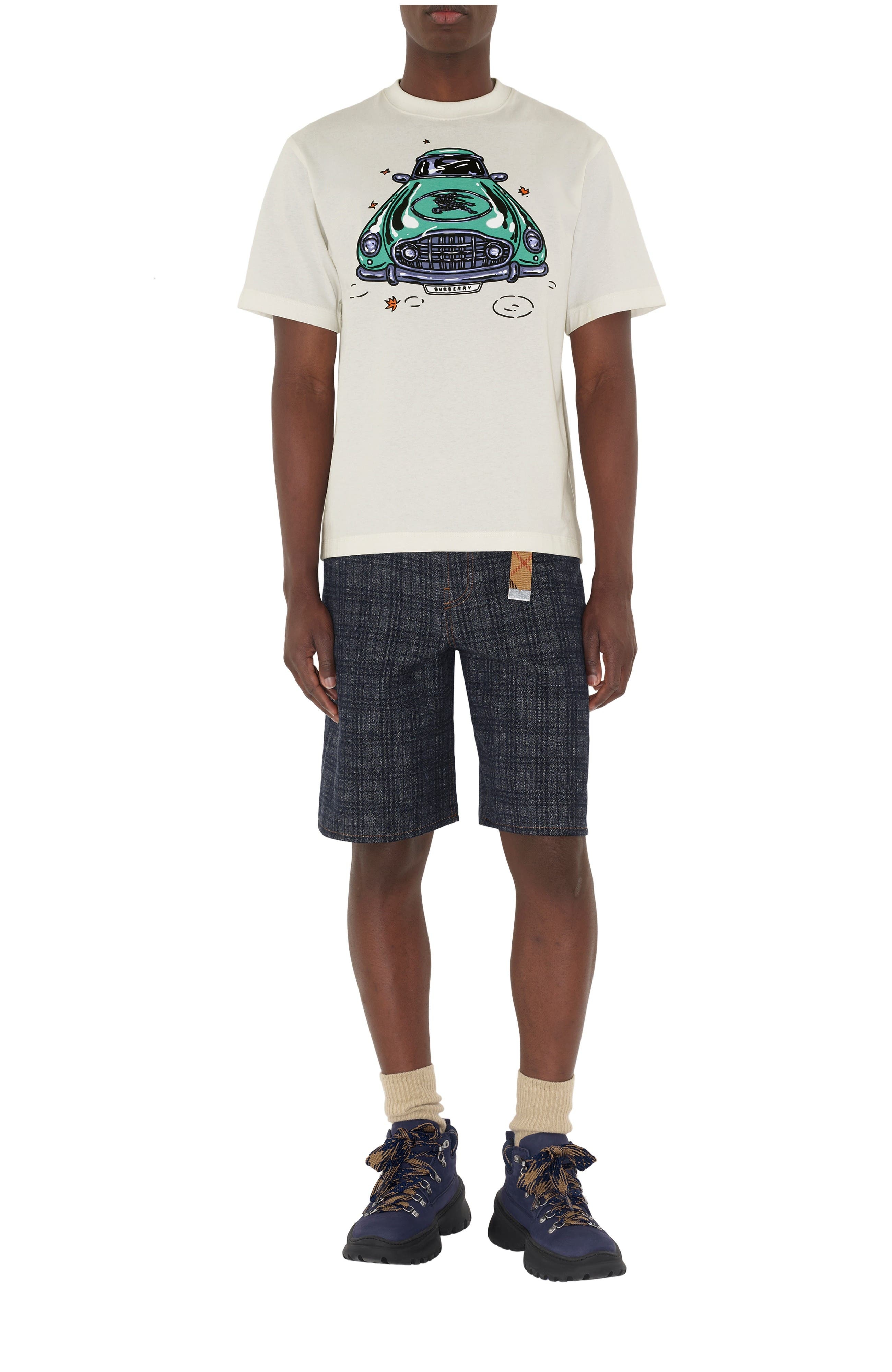 A T-shirt made from cotton jersey, cut to a relaxed fit. The seasonal print is inspired by vintage sports cars and depicts our Equestrian Knight Design on the front and a tyre-track logo at the back. ||Rib-knit neckline|Printed Burberry lettering at front and back Relaxed fit: a looser cut than our regular fit. Length: 74cm/29.1in (size UK L) 100% cotton Trim: 97% cotton, 3% elastane Machine wash Made in Portugal