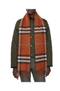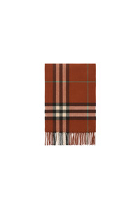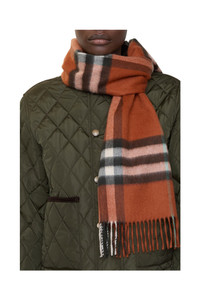 The iconic Burberry Check cashmere scarf, made in Scotland at a mill founded in 1797. Woven on traditional looms, the scarf takes more than 30 steps to complete. The fabric is washed in local spring water and brushed with teasels – dried flowers that are drawn along the surface of the cashmere to 'raise' the cloth, creating a natural lustre and ultra-soft finish.||Rectangular|Fringing at both ends 168 x 30cm/66.1 x 11.8in 100% cashmere Specialist dry clean Made in Scotland