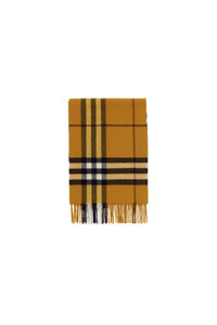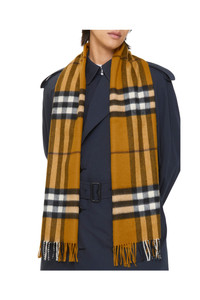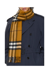 The iconic Burberry Check cashmere scarf, made in Scotland at a mill founded in 1797. Woven on traditional looms, the scarf takes more than 30 steps to complete. The fabric is washed in local spring water and brushed with teasels – dried flowers that are drawn along the surface of the cashmere to 'raise' the cloth, creating a natural lustre and ultra-soft finish.||Rectangular|Fringing at both ends 168 x 30cm/66.1 x 11.8in 100% cashmere Specialist dry clean Made in Scotland