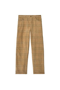 Trousers made in Italy from velvety cotton corduroy, woven with the Burberry Check and cut to a relaxed fit. The five-pocket style is detailed with diagonal belt loops and a suede patch embossed with the Equestrian Knight Design.||Button closure|Suede patch with embossed Equestrian Knight Design at back|Burberry Check tab at side Relaxed fit: a looser cut than our regular fit. Inside leg length: 81.5cm/32.1in (size IT 50) 100% cotton Trim: 50% calf leather, 50% lamb suede Machine wash Made in Italy