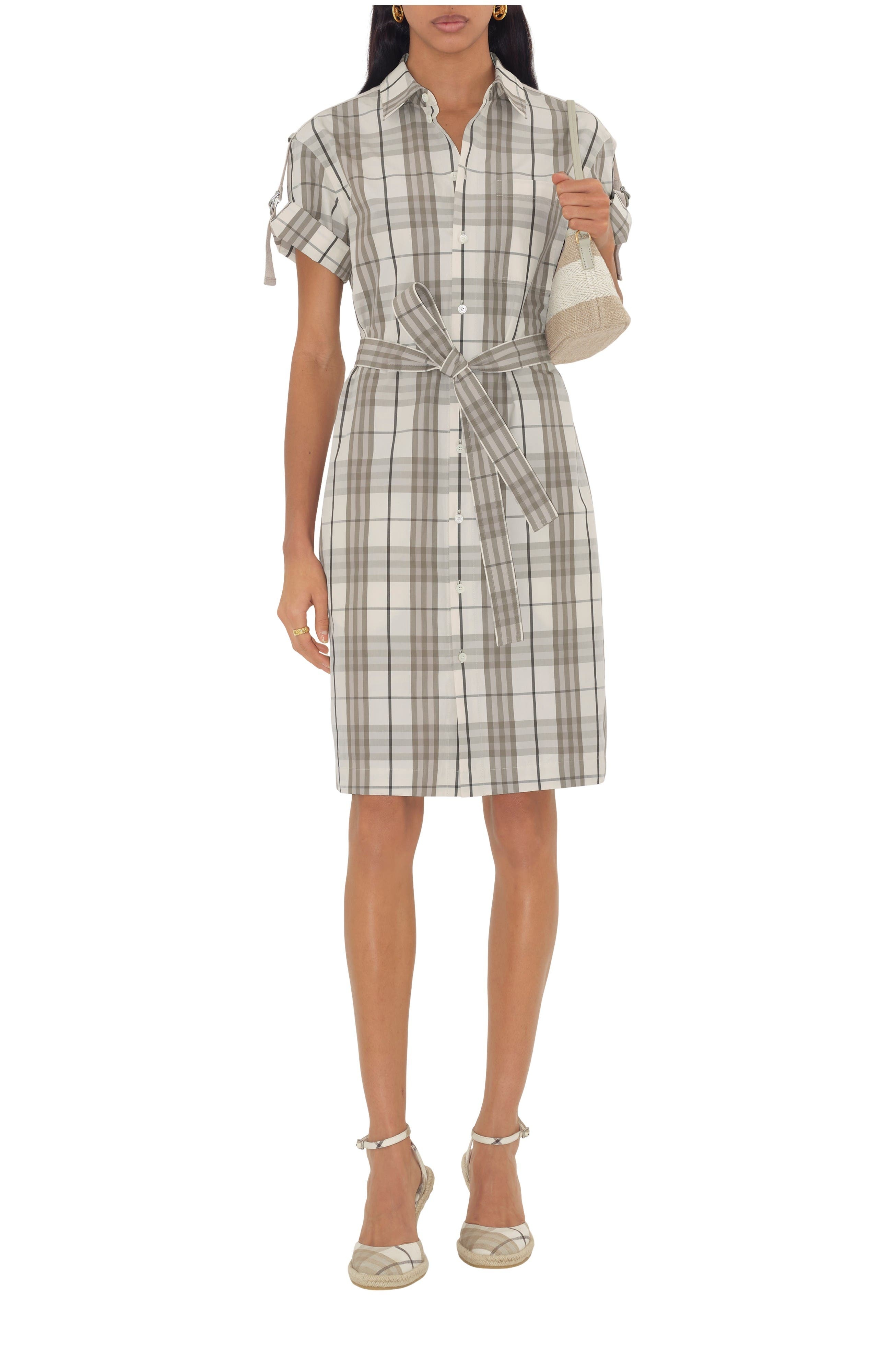 A shirt dress in Italian-woven cotton twill, patterned with the Burberry Check and tailored to a regular fit. Adjust the silhouette with the self-tie belt and adjustable B buckle straps at the folded cuffs. Our Equestrian Knight Design is embroidered at the chest pocket.||Button closure|Point collar|Chest patch pocket|Self-tie belt|Embroidered Equestrian Knight Design at pocket Regular fit. Fits true to size, take your normal size. Length: 96cm/37.8in (size UK 8) 100% cotton Pocket lining: 100% cotton Buttons: mother-of-pearl Specialist dry clean Imported